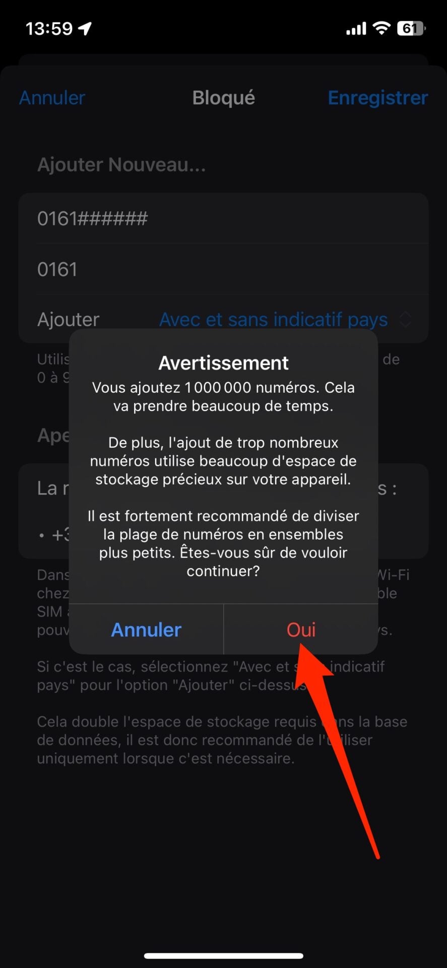 Appuyez ensuite sur le bouton Enregistrer pour sauvegarder votre première règle. Une fenêtre d’avertissement devrait alors s’afficher pour vous indiquer que vous vous apprêtez à bloquer un nombre conséquent de numéros et que cela peut poser quelques problèmes. Appuyez sur Oui pour valider votre règle. Begone va alors charger dans la base de données créée sur votre iPhone l’ensemble des numéros allant de 0161000000 à 0161999999.
