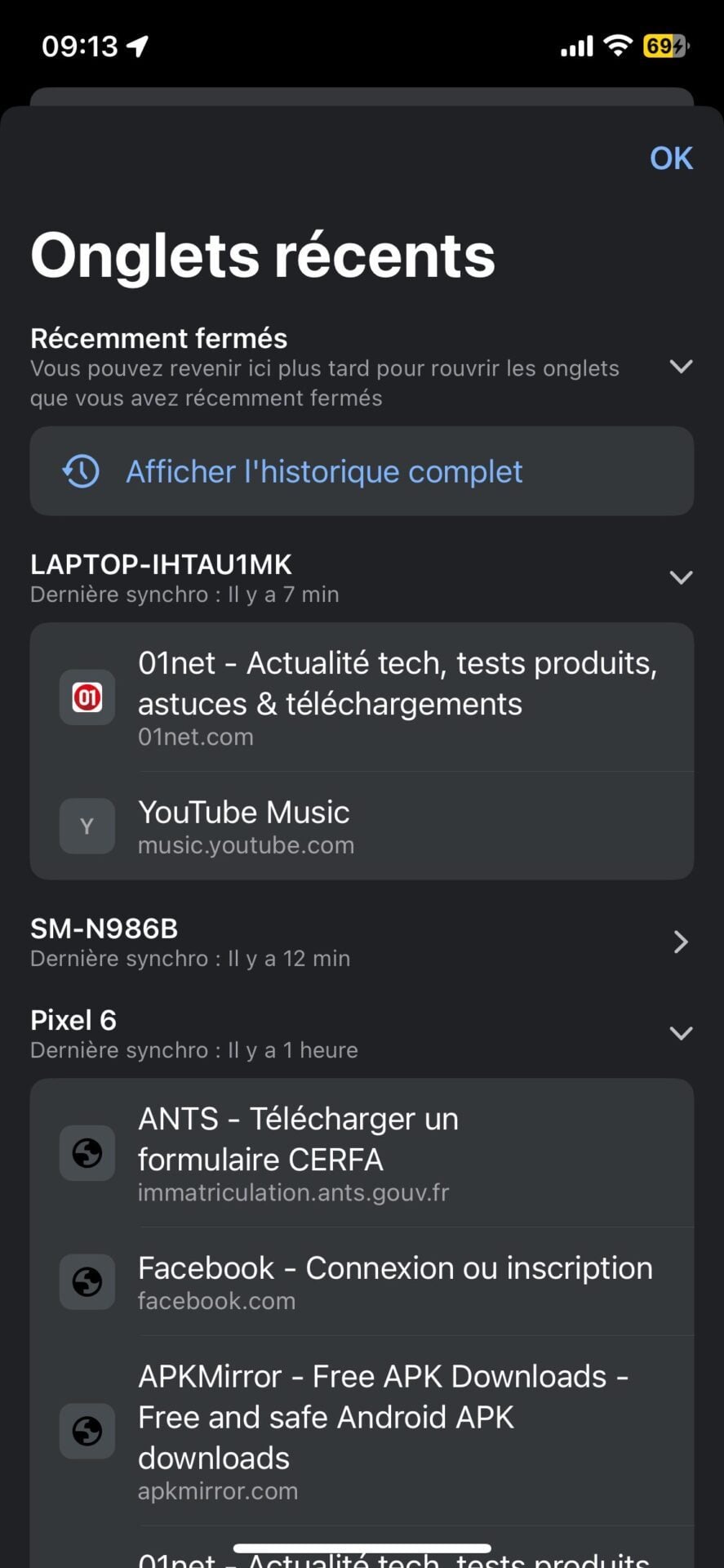 Après avoir redémarré Chrome, la liste des Onglets d’autres appareils devrait être automatiquement affichée à l’ouverture d’un nouvel onglet dans le navigateur.