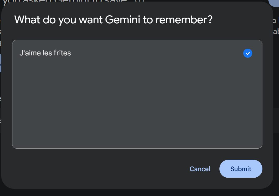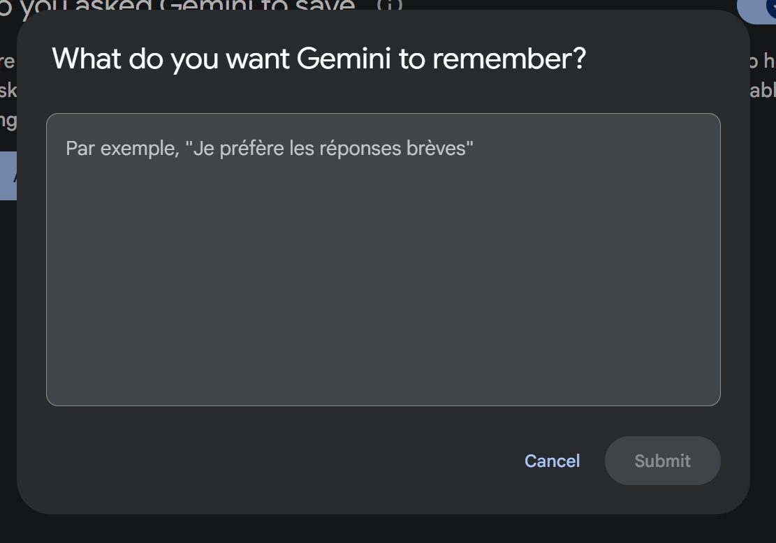 En cliquant dessus, une fenêtre s’ouvre et vous invite à ajouter un élément que Gemini pourrait retenir. La page précise préférer « les réponses brèves ». Si vous entrez une information en français, elle sera retenue en anglais.