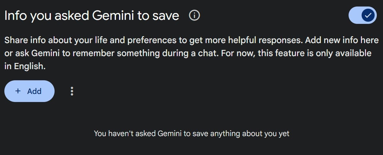 « Vous pouvez partager des infos avec Gemini et gérer celles qui sont déjà enregistrées en discutant avec lui de façon naturelle, ou en utilisant la page Informations enregistrées dédiée. Vous gardez le contrôle : vous pouvez facilement afficher, modifier et supprimer les informations que vous avez partagées avec Gemini. Il vous indiquera à quels moments vos informations enregistrées seront utilisées. »