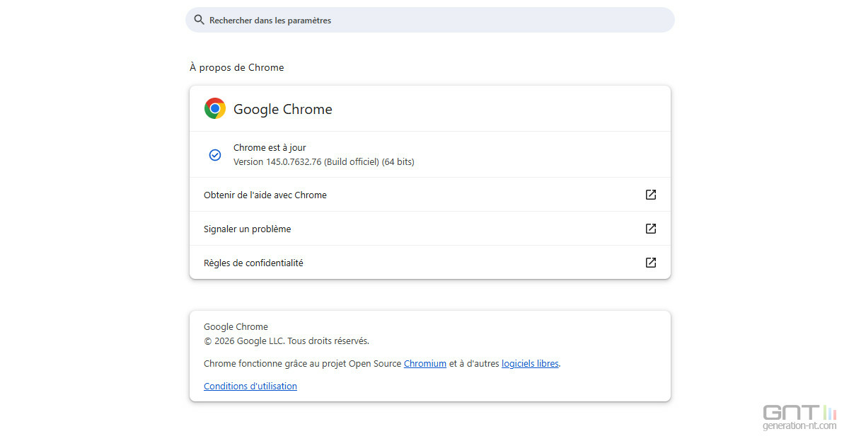 Au minimum, les versions protégées de Google Chrome sont 145.0.7632.75/76 pour Windows et macOS, et 144.0.7559.75 pour Linux. À vérifier dans Paramètres ou Aide, puis » À propos de Chrome « . Le cas échéant, cette action permettra la recherche et l’installation de la dernière version disponible.