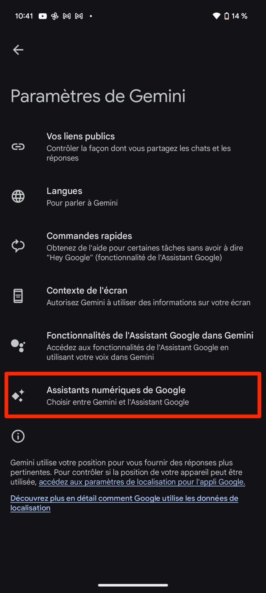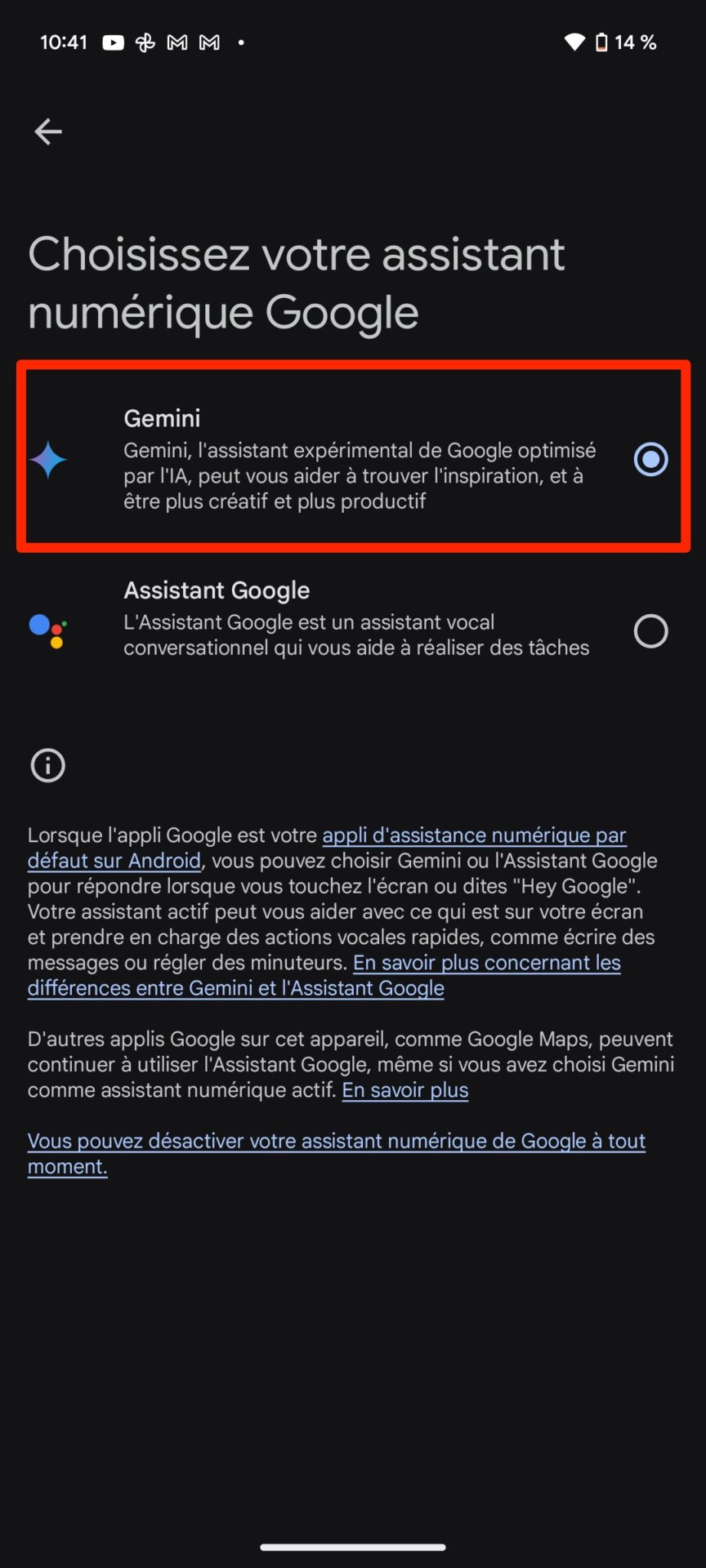 À noter que l’assistant propulsé par l’IA de Google sera capable de réaliser des tâches similaires à celles proposées par Google Assistant. Vous pourrez ainsi lui demander de lancer un minuteur, de passer un appel, ou encore d’enregistrer des rappels. Gemini devrait néanmoins évoluer très rapidement, Google précisant travailler « pour en intégrer davantage à l’avenir ». Gemini pourrait d’ailleurs pousser rapidement Google Assistant dans la tombe. Google propose en effet déjà de choisir si vous préférez utiliser par défaut Google Assistant ou Gemini. Pour ce faire, il vous faudra toutefois vous rendre dans les Paramètres de Gemini, puis dans le menu Assistants numériques de Google, sélectionner Gemini. Vous pourrez alors vous adresser à Gemini directement en utilisant la phrase de réveil “OK Google” utilisée habituellement avec Google Assistant.