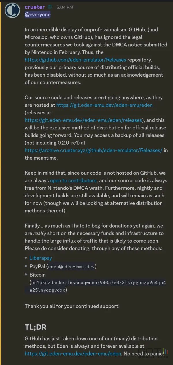 Nintendo Switch Emulator, Eden, just had it’s github shut down. Reportedly, Microsoft/Github ignored the legal countermeasures from the Eden team.