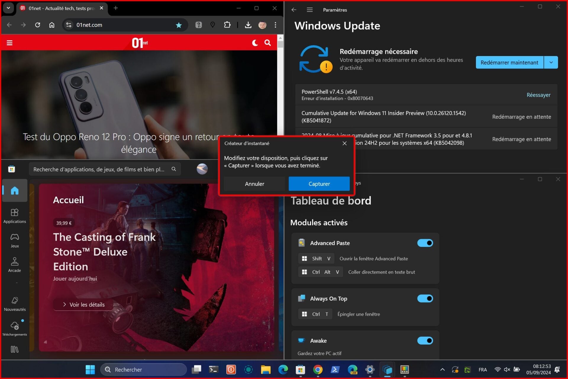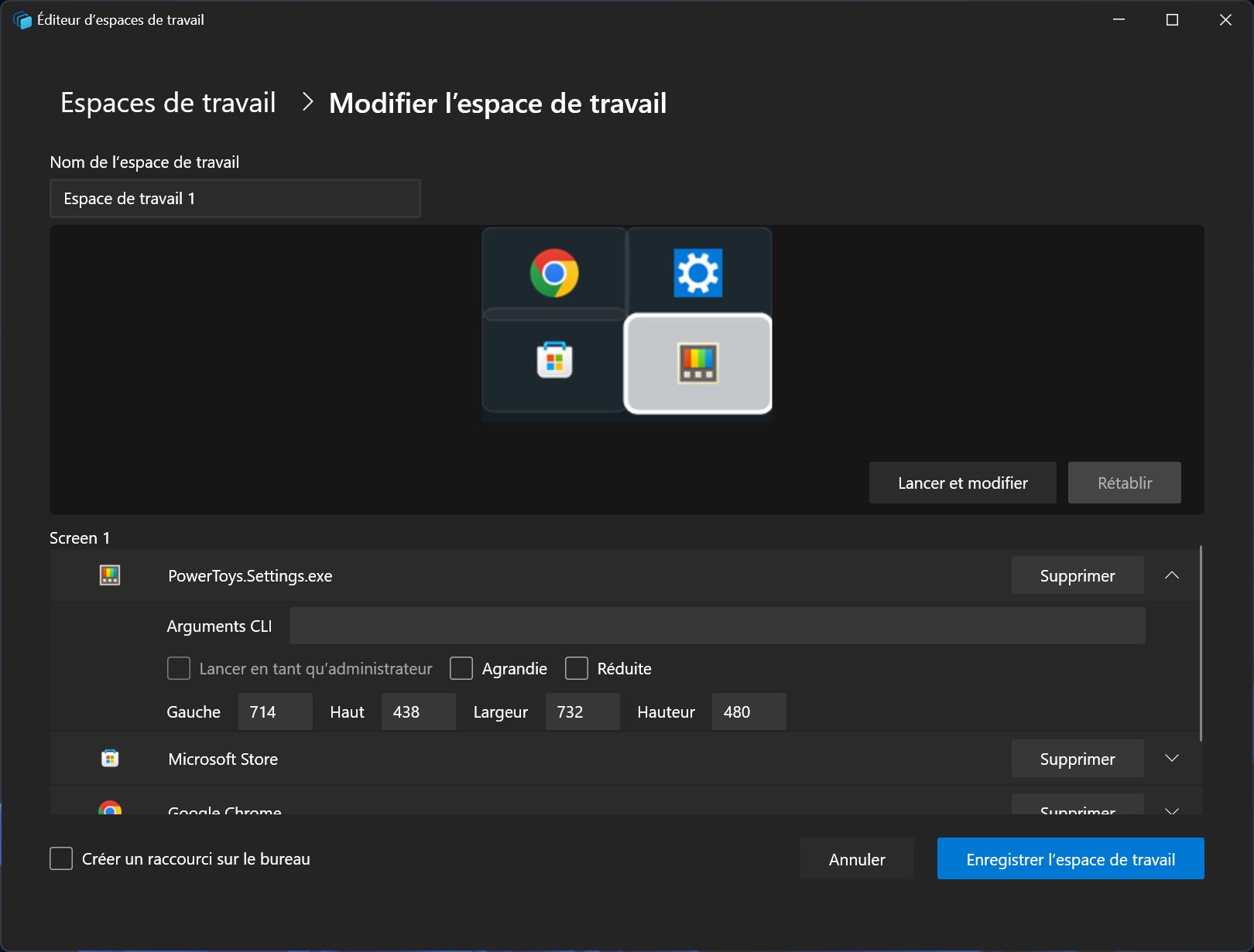 Il suffit ensuite de cliquer sur le bouton Capturer dans la fenêtre Créateur d’instantané pour immortaliser votre configuration et enfin Enregistrer l’espace de travail. À noter que vous pourrez modifier manuellement le positionnement et la taille des fenêtres (ou utiliser le système d’ancrage des fenêtres natif de Windows 11), mais aussi choisir s’il faut exécuter, ou non, les applications en tant qu’administrateur.