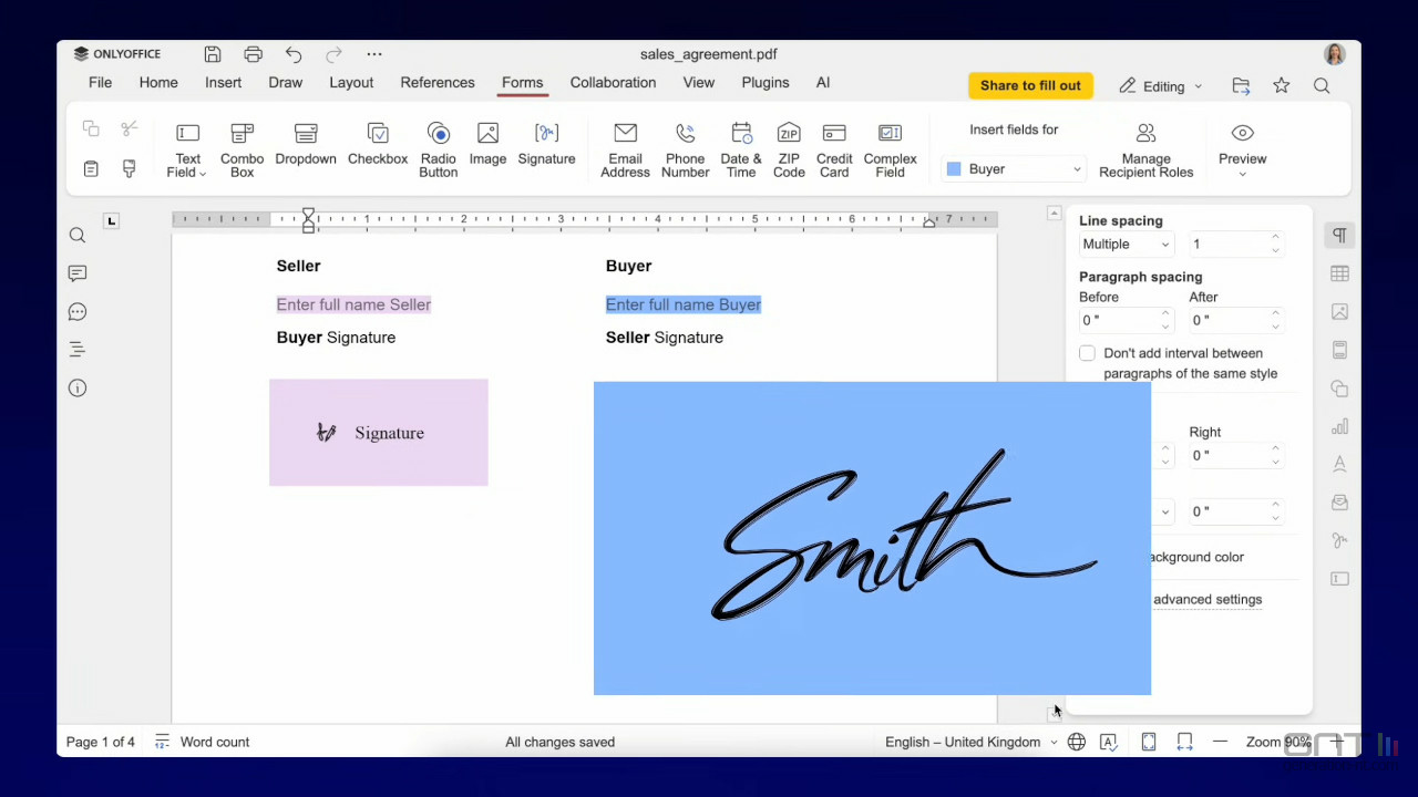 L’une des attentes fortes des utilisateurs concernait la signature de documents. ONLYOFFICE Docs 9.3 répond présent en introduisant de nouvelles options pour les formulaires PDF. Si le téléchargement d’images reste possible, les utilisateurs peuvent désormais dessiner la signature directement à la souris ou sur un écran tactile.