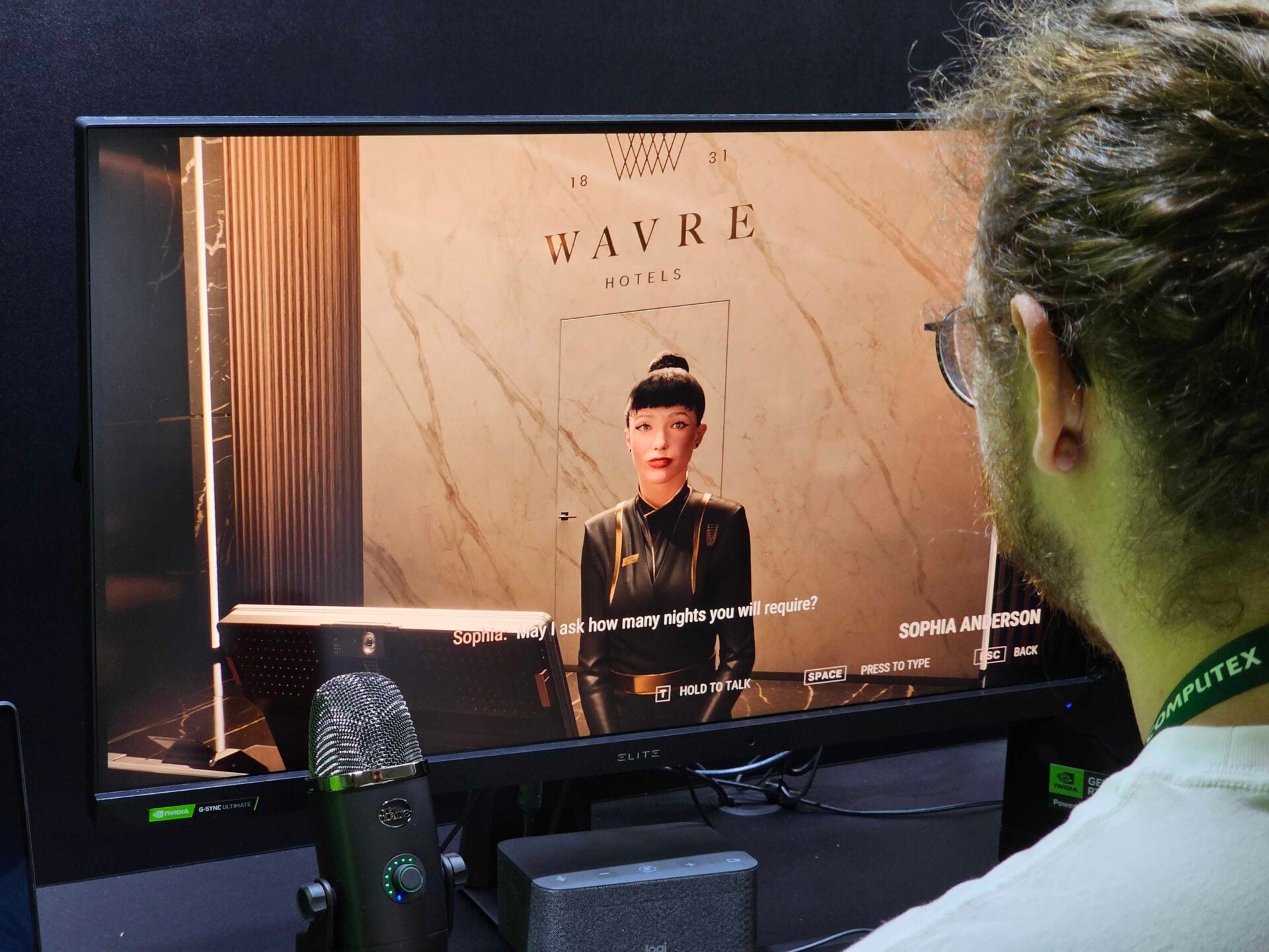 Dans une démo technique mise sur pied par Nvidia et le studio Inworld, nous avons pu mener une petite enquête dans le hall d’entrée d’un hôtel, le tout en français et traduit automatiquement vers l’anglais sur le jeu. Trois personnages s’y trouvaient, dont un homme et une réceptionniste, qu’il fallait manipuler pour obtenir une information.