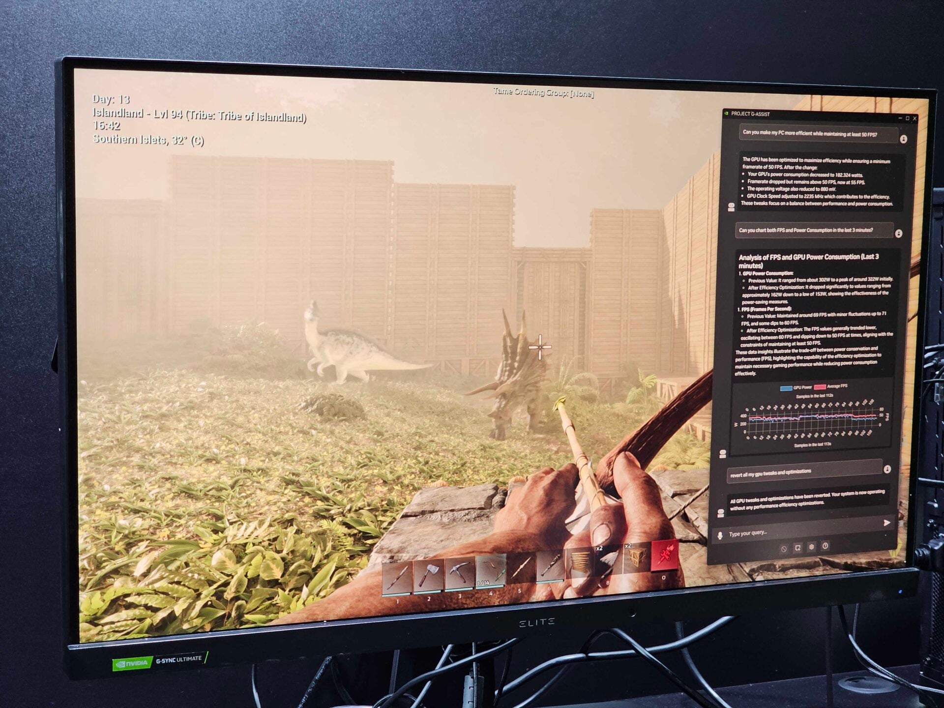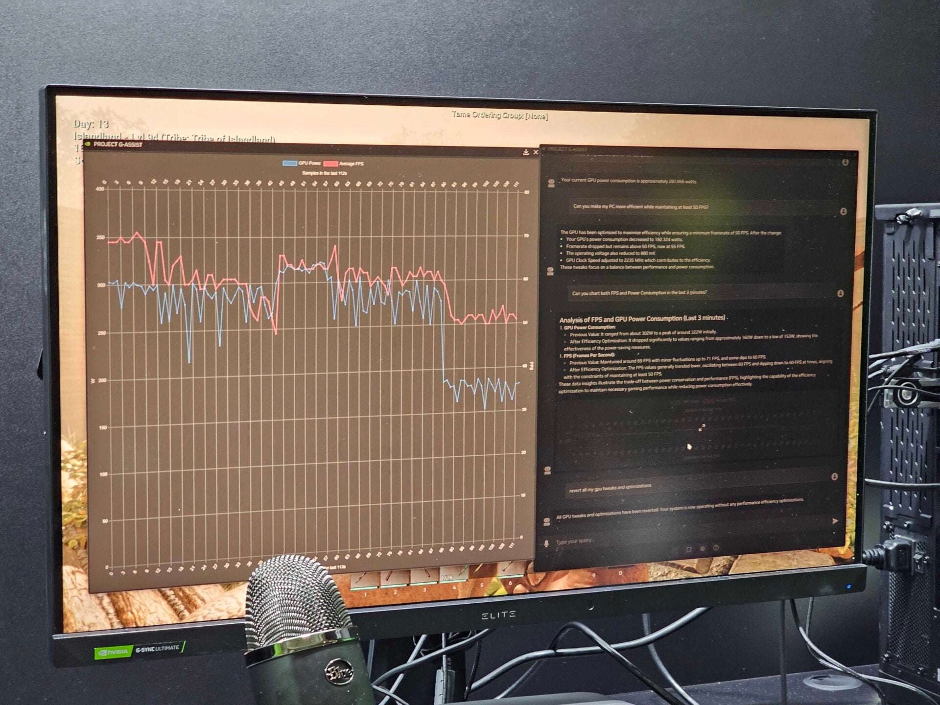 Mais ce qui nous le plus impressionner, c’est surtout lorsque le démonstrateur lui a demandé de changer les réglages graphiques du jeu pour réduire la consommation tout en conservant le rafraichissement au-dessus des 55 FPS. Non seulement G-Assist y est parvenu avec succès, mais il était en outre capable de fournir un graphe complet des performances des dernières minutes. Tout cela simplement en parlant à notre ordinateur, sans avoir besoin de passer par un quelconque écran de paramètres.