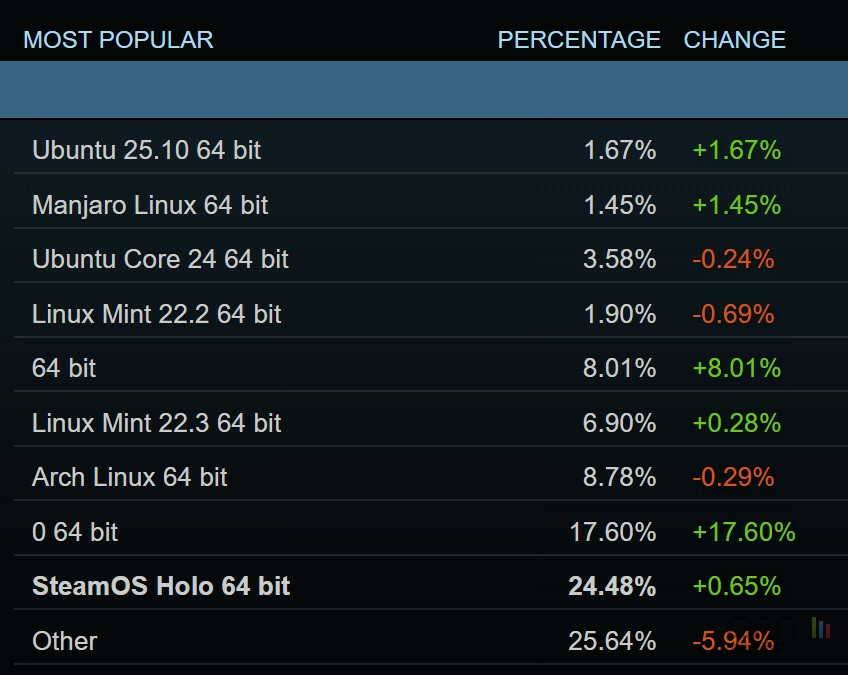 D’après l’enquête, environ un quart des joueurs sur Linux (24,48 %) utilisent SteamOS Holo, le système d’exploitation qui équipe la console portable.