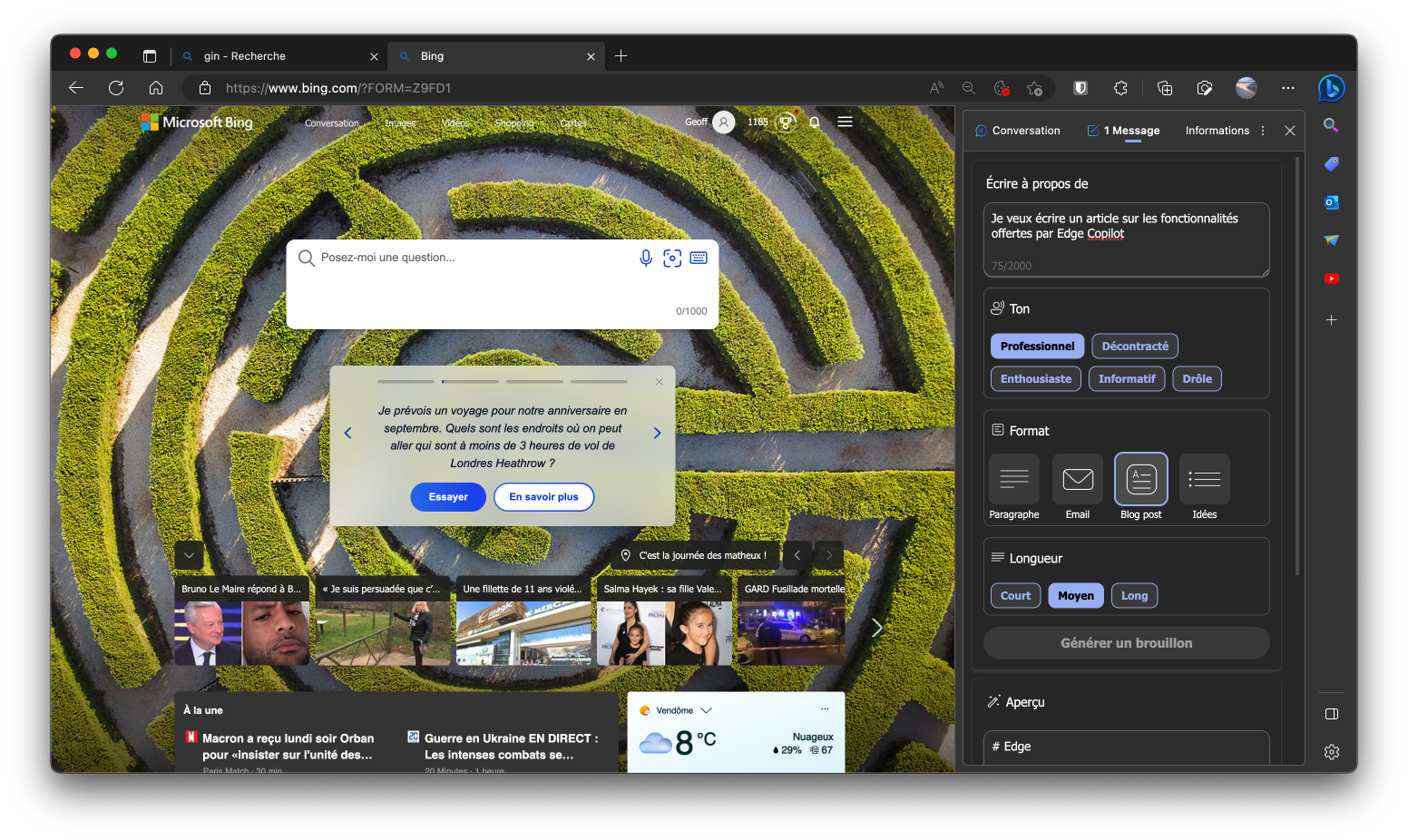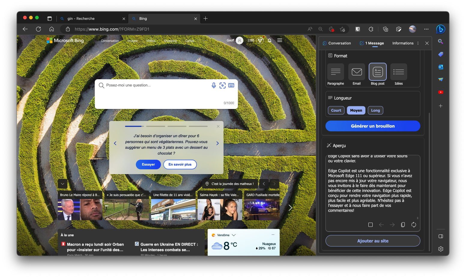 Concrètement, Edge Copilot est capable d’afficher des informations et suggère des contenus susceptibles de vous intéresser. Pour cela, le module se base sur le contexte de la page active que vous consultez. Mais ce n’est pas tout. Désormais, le module qui accueille déjà la fonction Conversation propulsée par ChatGPT (Bing Chat), inaugure une fonction Message. Son but ? Vous accompagner dans vos tâches rédactionnelles. Il vous suffit ainsi d’indiquer ce sur quoi vous voulez écrire, de choisir un ton d’écriture, un format rédactionnel (paragraphe, e-mail, blog post, etc.), et de choisir la longueur de texte souhaitée pour demander à Edge Copilot de Générer un brouillon. L’aperçu du texte généré apparaît alors immédiatement dans l’encadré prévu à cet effet. Vous pourrez alors vous appuyer dessus pour vos écrits, ou choisir tout simplement de le copier-coller pour l’exploiter dans un document.