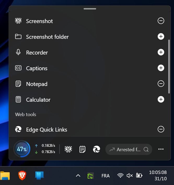 Plusieurs raccourcis y sont par ailleurs intégrés par défaut : pour ouvrir l’Outil Capture d’écran, le Bloc-notes ou des onglets récents de Microsoft Edge. Microsoft y a même intégré un champ de recherche (encore !) pour lancer une requête rapide sur son moteur de recherche Bing, dans ouvert dans Edge évidemment. Tous ces raccourcis ne sont toutefois pas figés. Vous pouvez en effet les personnaliser, en rajouter, ou en supprimer.