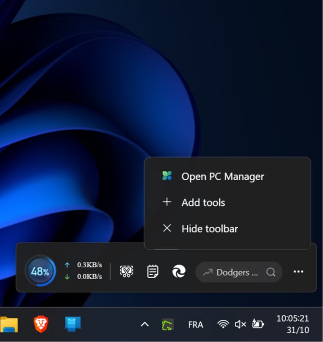 La dernière mouture de l’utilitaire, estampillée 3.14, inaugure plusieurs nouveautés, dont une toute nouvelle barre d’outils qui reste épinglée à l’écran et qui permet notamment de surveiller le débit de votre connexion. Cette nouvelle version de PC Manager inaugure également un nouvel algorithme de nettoyage qui offre une plus grande efficacité au module de nettoyage de disque.
