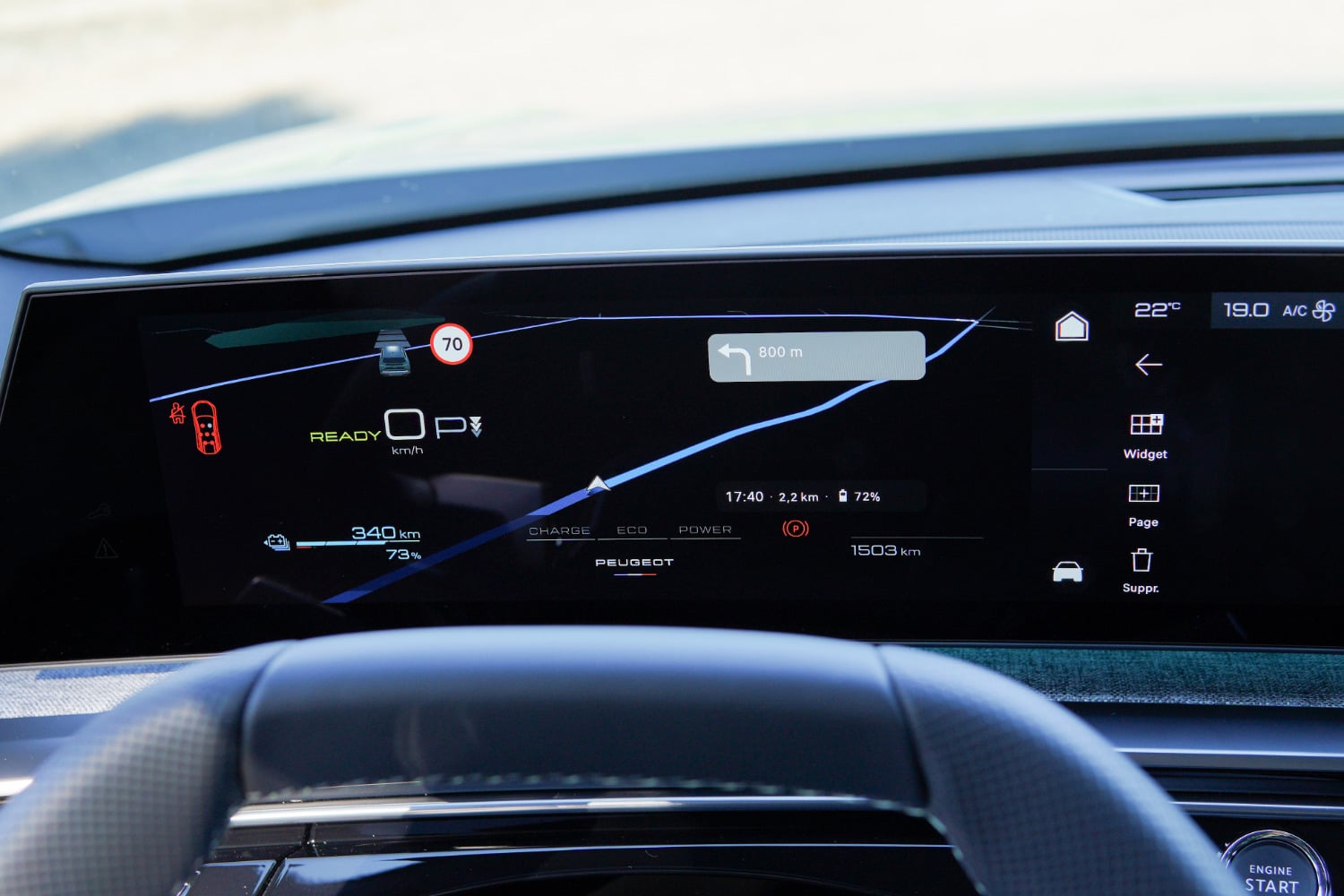 Côté manipulation, l’expérience numérique à bord du Peugeot e-5008 n’est pas au niveau non plus. Il y a bien l’écran secondaire, au format de bandeau, avec ses boutons raccourcis, mais il n’est disponible que sur le niveau GT du modèle et ne règle pas un problème d’ergonomie plus large à bord, pour trouver certaines commandes. Cela passe notamment par le manque de possibilités depuis les boutons du volant. Par exemple, il faut passer par le bouton des paramètres de l’écran principal pour ajouter sur l’écran derrière le volant un raccourci vers la navigation. Une manipulation qui demande bien quatre étapes, à réaliser uniquement à l’arrêt.