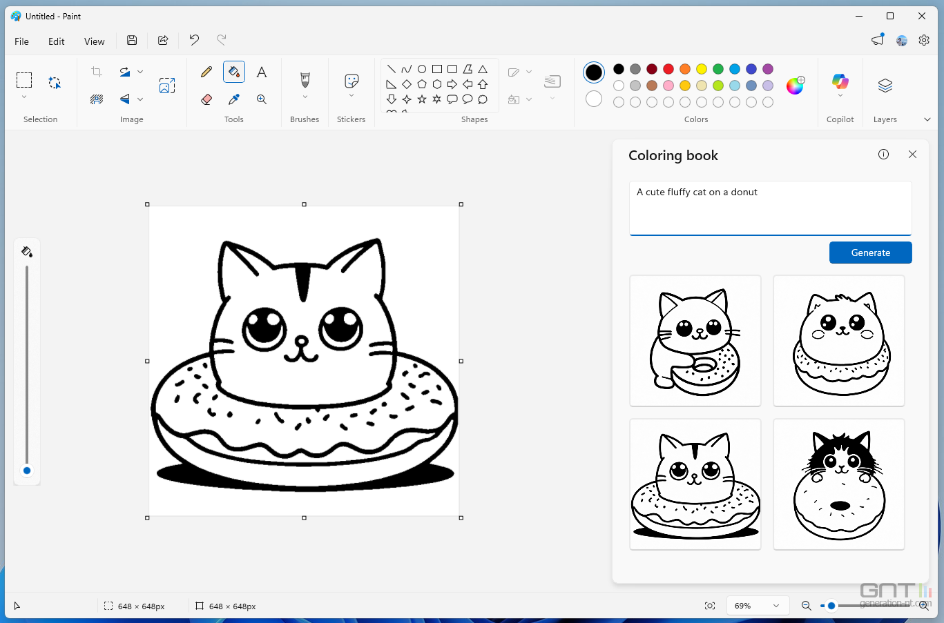 L’application Paint bénéficie d’une nouvelle fonctionnalité baptisée » Coloring book « . Propulsée par l’IA, elle permet de générer des pages de livre de coloriage uniques à partir d’un prompt. Il suffit de décrire ce qui est souhaité, comme » un chat mignon et duveteux sur un donut « , pour que l’outil produise plusieurs propositions à colorier.
