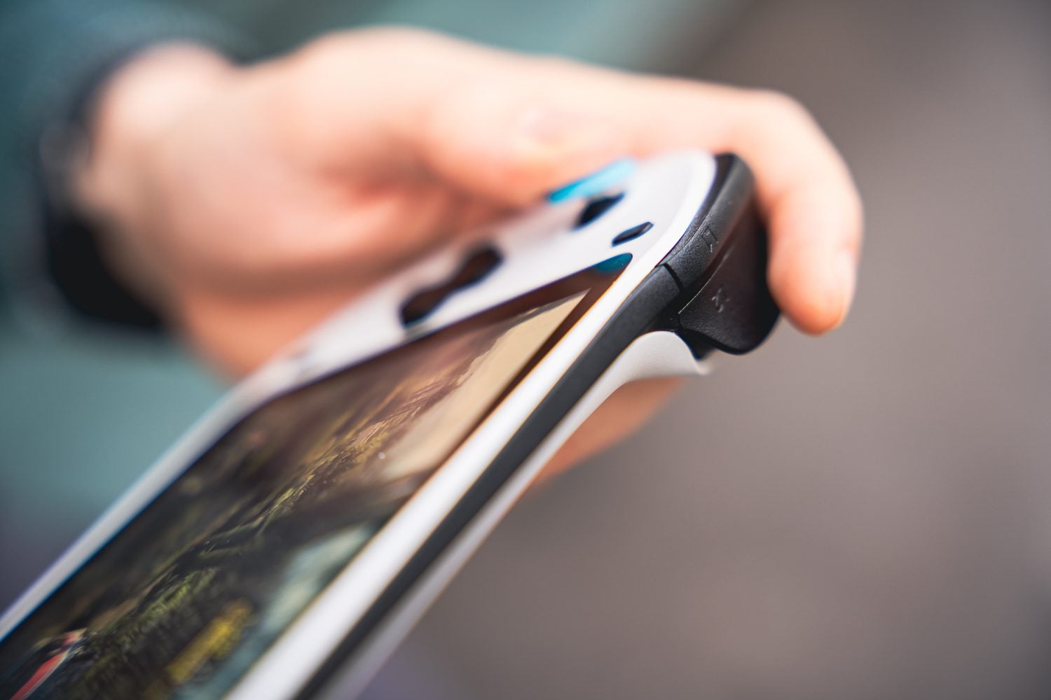 La console se montre légère en main, 430 g et plutôt confortable. Seul petit reproche qu’on puisse lui faire sur ce front, elle manque sans doute d’un tout petit peu de profondeur au niveau des mains pour être parfaitement préhensible. Il faut cependant reconnaître que le grip reste très bon dans l’ensemble. Ajoutons que les haut-parleurs sont sans doute un peu mal placés étant donné qu’ils tombent pile sous la paume de la main.