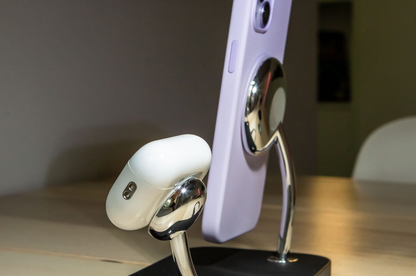 Deux bras métalliques émergent de la base plane et relativement fine. Ils ont de faux airs de vieux rétroviseurs rétro… Celui de gauche, le plus haut, permet d’y aimanter un iPhone, verticalement ou horizontalement – si vous voulez continuer à regarder un film en rechargeant le smartphone sans avoir à le tenir. L’aimant MagSafe permet de ne pas avoir à tergiverser pendant des heures pour positionner l’iPhone, c’est l’affaire d’une petite seconde. Nous y avons accroché différents formats d’iPhone, et même le 14 Pro Max tient sans le moindre problème.