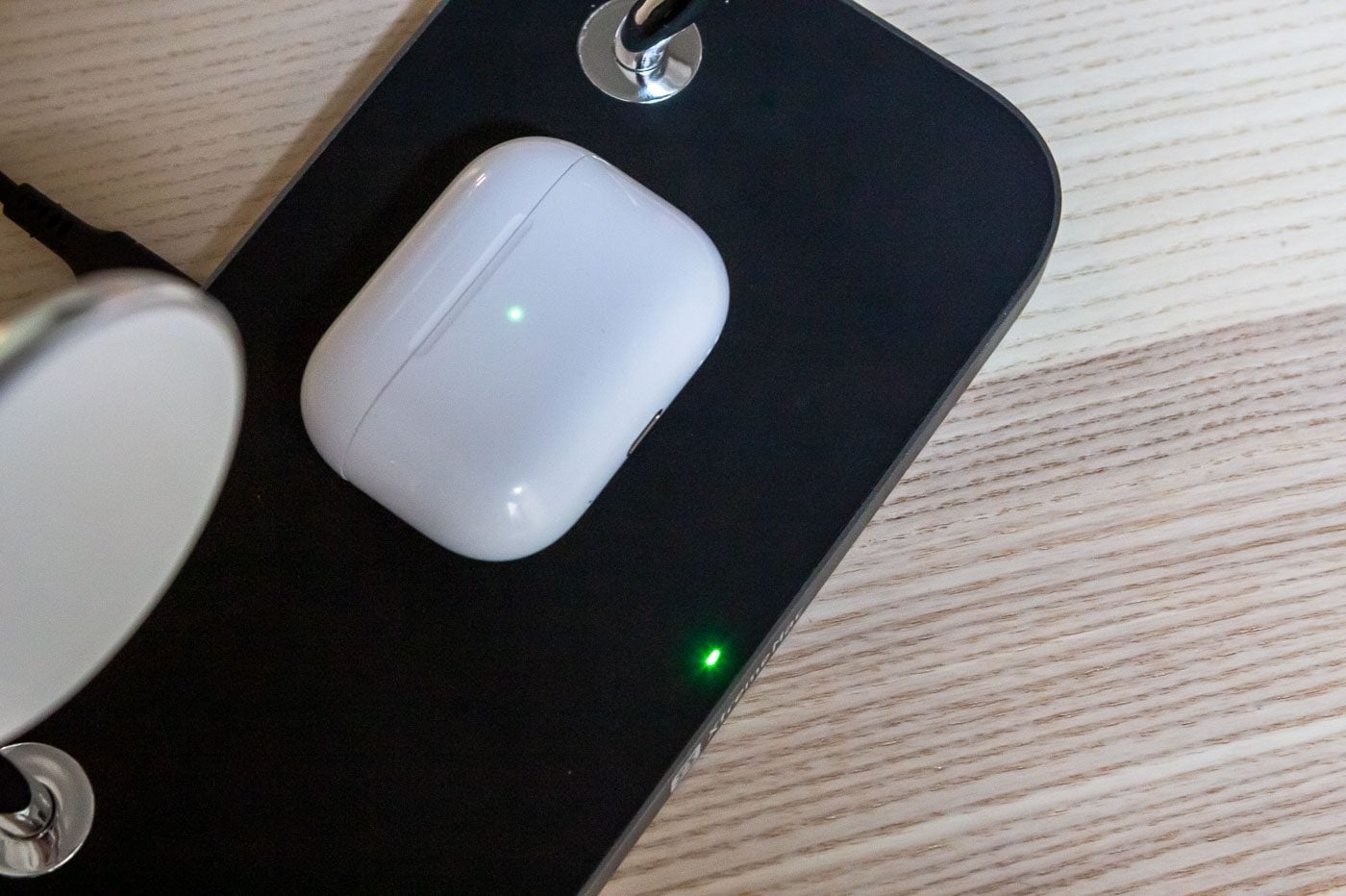 Deux bras, donc, pour un trois-en-un, le compte n’y est pas ! Car, pour recharger les boîtiers d’AirPods compatibles avec la recharge sans-fil Qi, il suffit de les déposer nonchalamment, mais avec une certaine précision tout de même sur le socle même du Xmag Pro. Si vous possédez les AirPods Pro de deuxième génération, vous entendrez un petit tintement pour vous indiquer que la charge a commencé, tandis que le voyant lumineux en façade s’allumera. Mais XtremeMac a eu la bonne idée de faire ajouter lui aussi un petit voyant vert sur son support pour vous indiquer que la charge est en cours. Que demander de plus ?