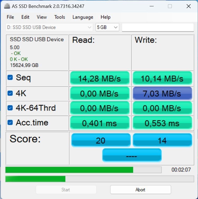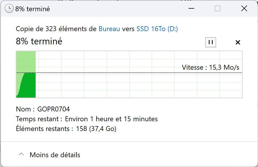 Pour mettre à l’épreuve le disque, nous lançons une première copie de fichiers. Il s’agit d’une longue série de rushes stockés sur un (vrai, celui-là) SSD du service vidéo de la rédaction. 40 Go que nous avons dupliqués en moins de deux minutes sur notre ordinateur. Et que nous avons ensuite dupliqués depuis la machine sur notre disque pas cher. Et là, nous nous rendons compte qu’il va falloir être très patient. Car ce « SSD » plafonne à… 15,5 Mo/s !