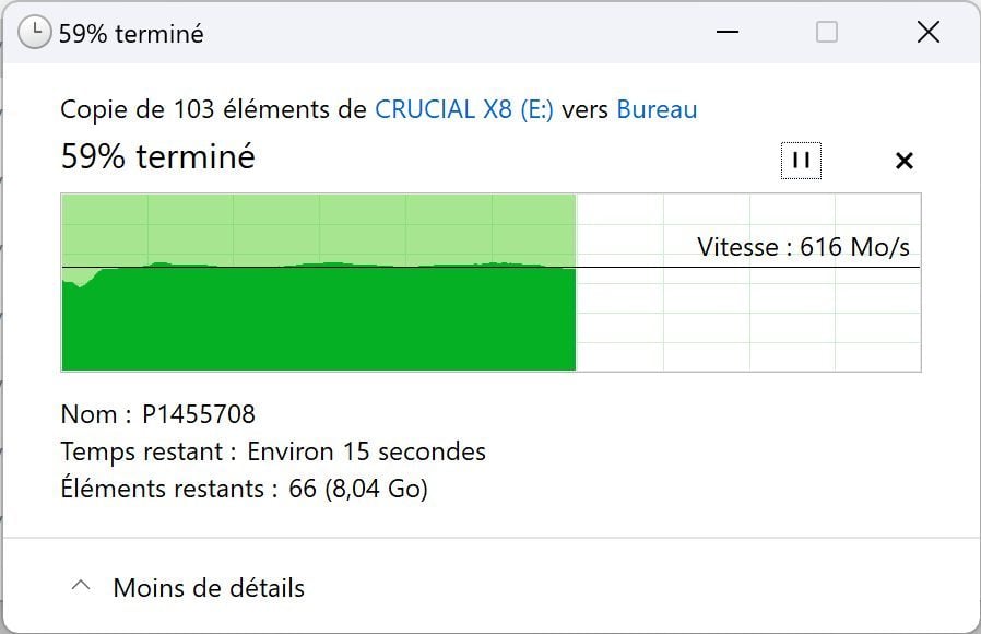C’est presque quarante fois moins rapide que les taux de transfert d’un véritable SSD. Ce qui nous a pris que quelques minutes auparavant va ici durer presque une heure trente ! Et même beaucoup plus, car le disque a été subitement déconnecté en plein transfert, sans aucune raison. Il nous a fallu nous y prendre à trois fois avant de parvenir à copier nos quarante malheureux gigaoctets.