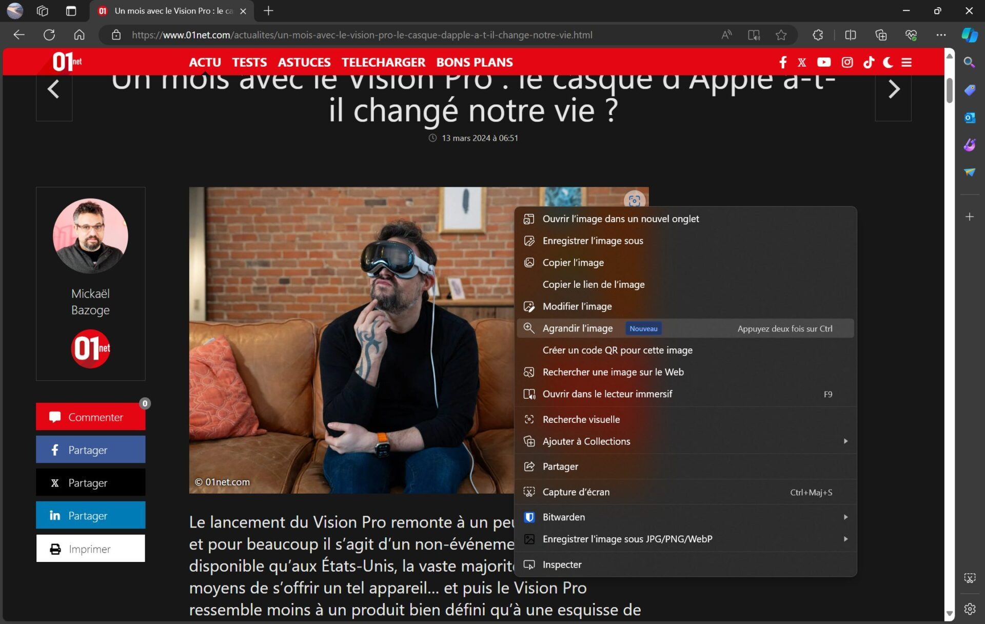 Si vous utilisez quotidiennement Microsoft Edge, vous avez peut-être remarqué l’arrivée d’une nouvelle option dans le menu contextuel lorsque vous faites un clic droit sur une image : Agrandir l’image. En sélectionnant celle-ci, l’image sur laquelle vous venez de cliquer s’ouvre automatiquement en grand format dans une fenêtre flottante. En bas à droite de cette fenêtre, trois boutons permettent de zoomer, dézoomer, revenir au niveau de zoom initial.