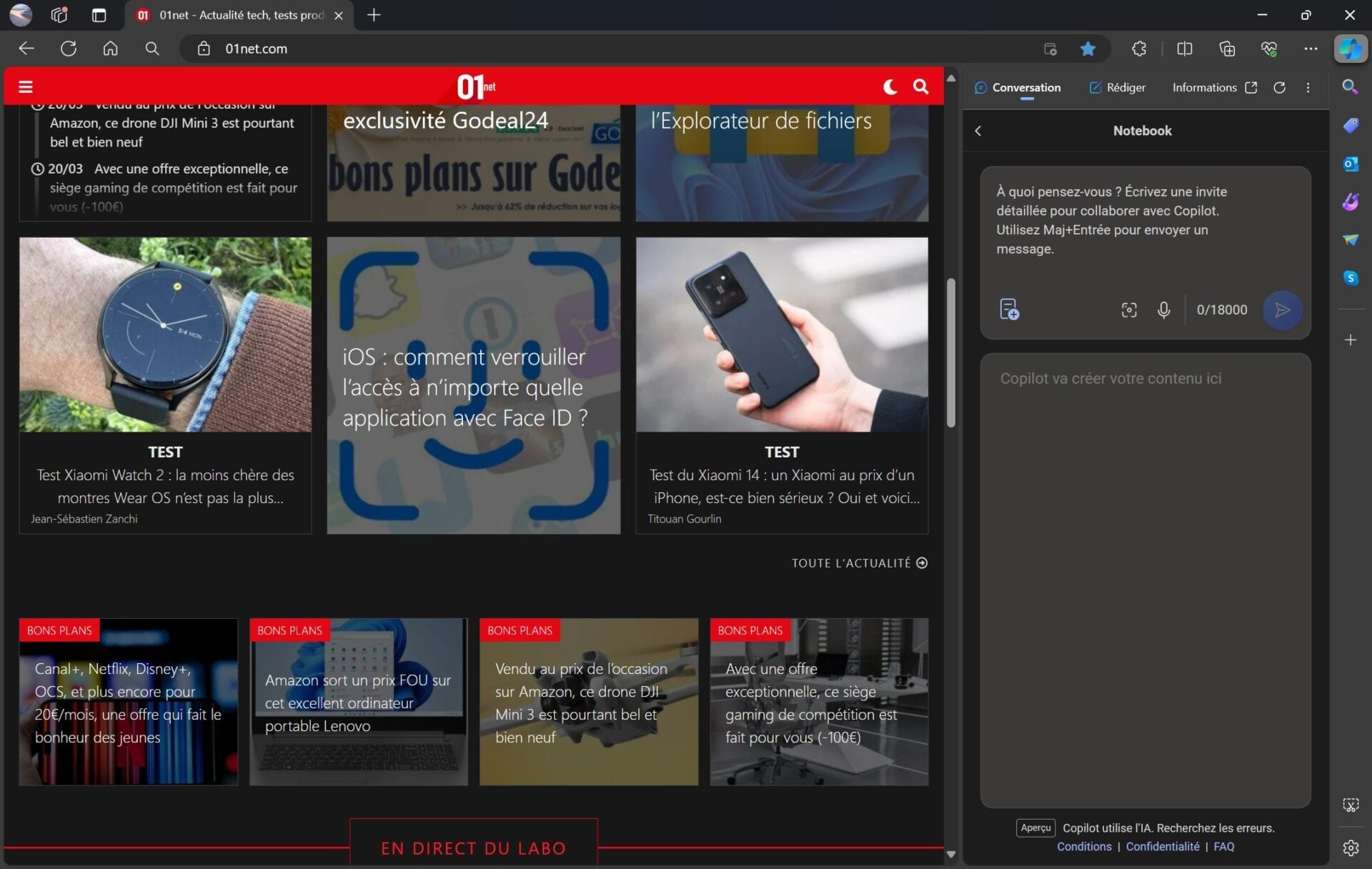 L’assistant Copilot, déjà intégré à Edge, pourrait voir arriver deux nouveaux outils. Le premier, Bloc-Notes (Notebook en anglais), permet d’accéder à une version améliorée de Copilot, et surtout moins limitée.