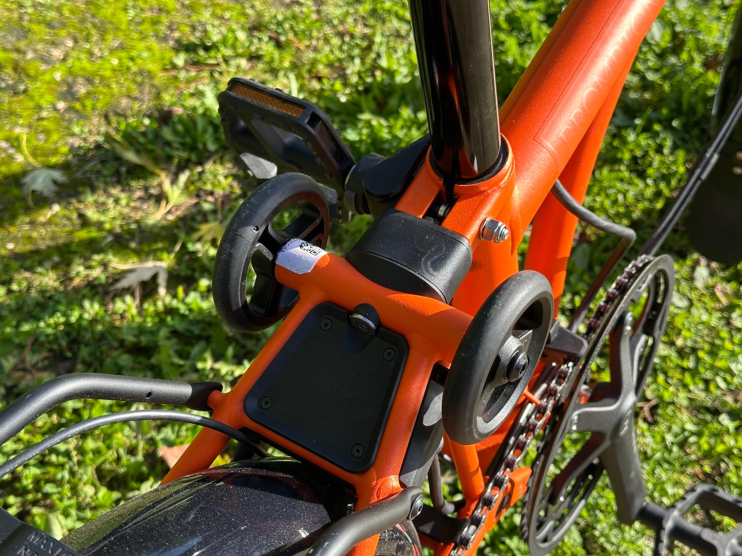 Malgré cet embonpoint, ce nouveau modèle conserve tout à fait l’esprit de la version originale. Il est également bon de préciser qu’il ne la remplace pas du tout, mais se charge d’élargir la gamme de la marque. Non seulement son aspect se révèle fidèle, mais aussi son système de pliage. Il faut pour cela passer la roue arrière sous le vélo, ramener la roue avant vers l’arrière et le fixer sur une base grâce à un ergot. Enfin, on replie le tube de direction et on rentre le tube de selle. Pour le déplier, on inverse la procédure, les pinces de charnière sont auto alignantes, faciles à manipuler, et ne nécessitent pas beaucoup de tours pour serrer fermement l’ensemble. On regrette en revanche l’absence de graduation sur le tube de selle qui aurait facilité le réglage de sa hauteur à chaque fois qu’on le déplie. Après un peu d’entraînement, cette manipulation ne prend pas plus de 20 secondes.