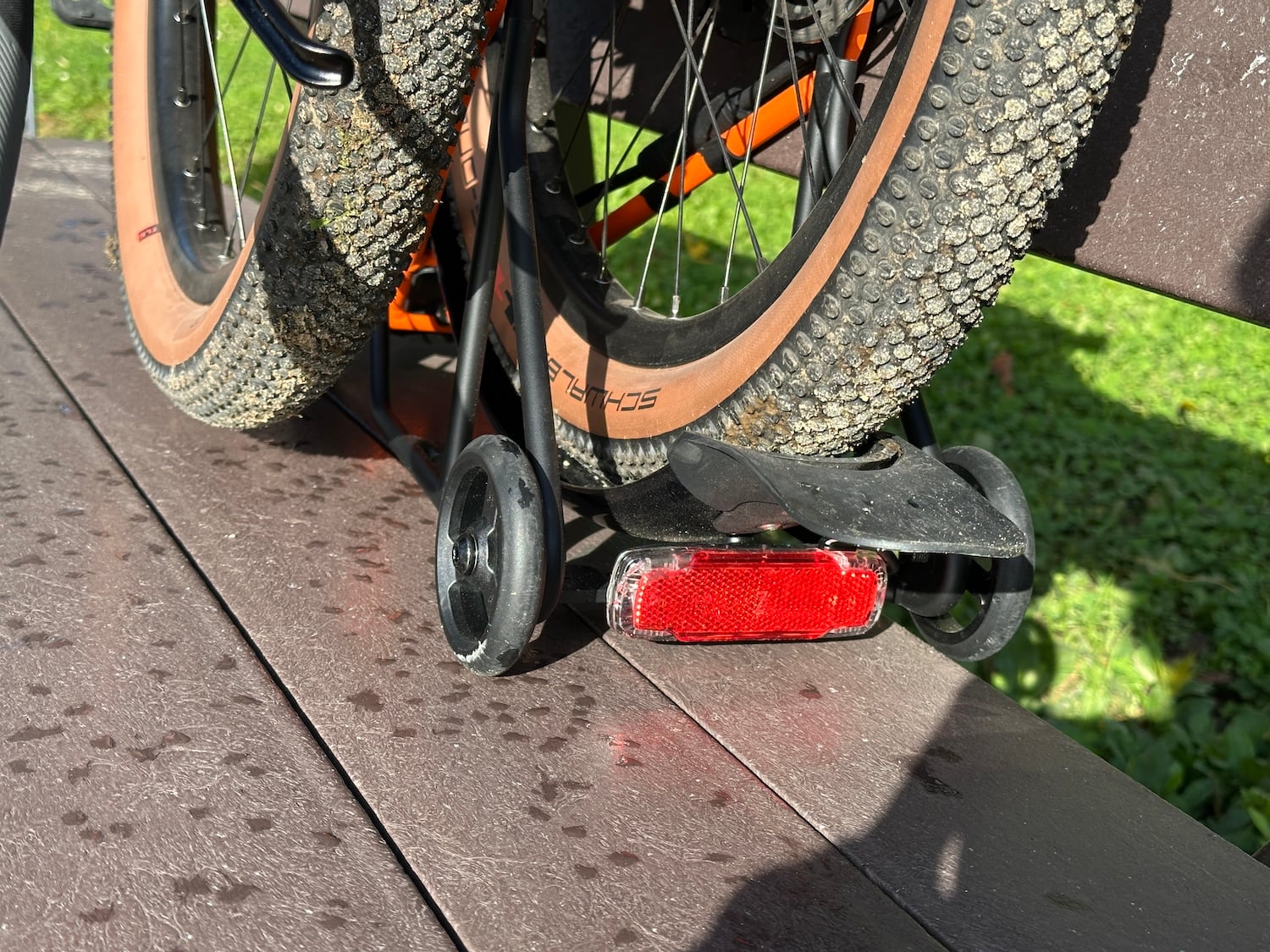 Mais c’était surtout une fois sur sa selle que nous étions curieux de savoir comment roulait ce G Line électrique. En effet, Brompton l’a très bien doté en vue d’une utilisation hors des sentiers battus. Pour commencer, les roues de 20 pouces sont équipées d’excellents pneus G-One All Round de la marque allemande Schwalbe. Avec leurs nombreux picots, ils assurent une excellente tenue de route, même lorsque les chemins se font un peu gras. Attention, il ne s’agirait pas non plus de s’aventurer dans la boue où ils atteignent rapidement leurs limites. Leur section de 54 mm permet d’apporter un peu plus de confort au vélo, déjà bien aidé par une selle bien rembourrée, de grandes pédales en résine, un cadre en acier relativement souple (la fourche est en aluminium) et un cintre large (660 mm) équipé de poignées ergonomiques. Sans être non plus équivalent à celui d’un VTT suspendu, le confort est incomparable par rapport au Brompton original ; on s’approche clairement de celui d’un gravel.