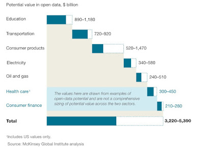Une étude de McKinsey avait marqué les esprits il y a huit ans en posant le potentiel de l’ouverture des données (pas que l’opendata du secteur public) et l’avait évalué entre 3 et 5 milliards de milliards, à l’échelle de l’économie mondiale.