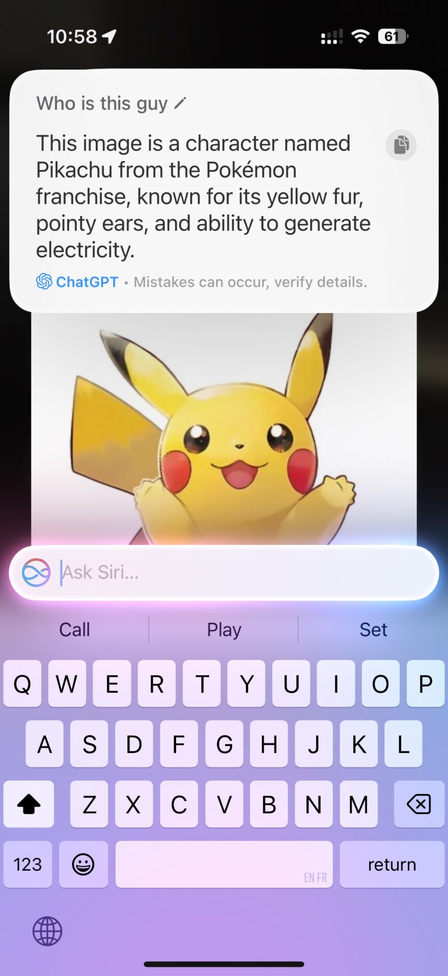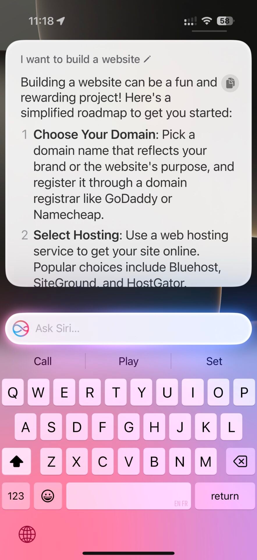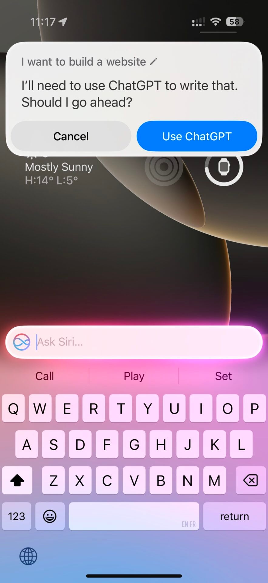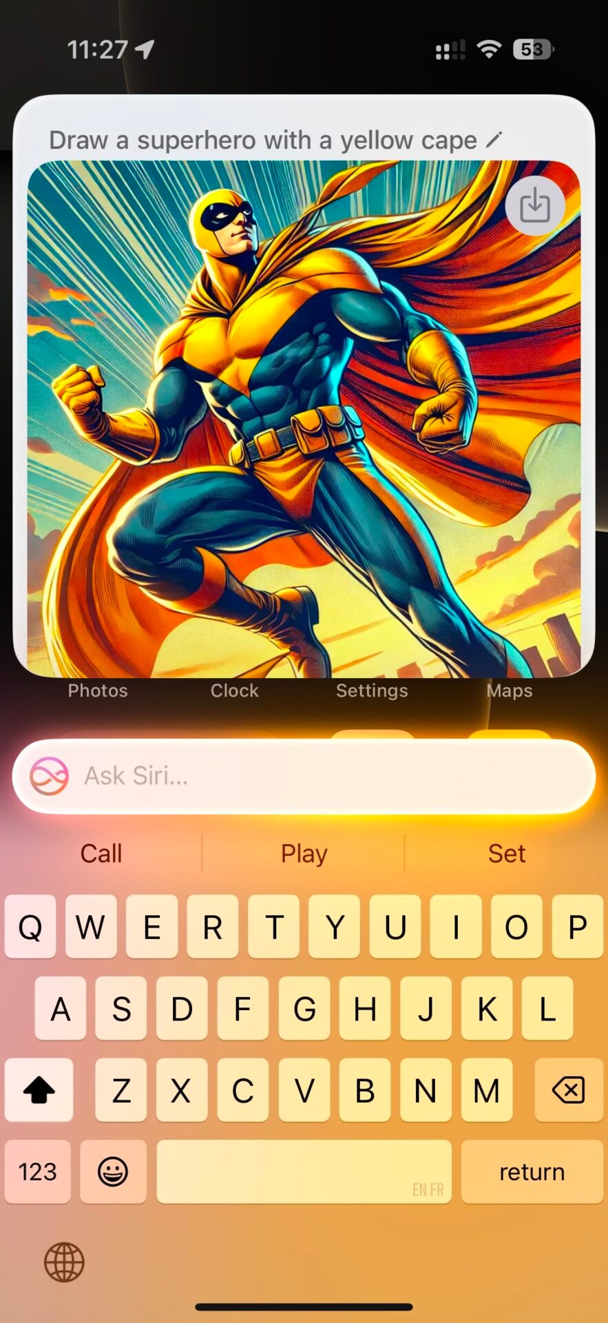 Outre les réponses textuelles, ce dernier peut aussi mettre ses talents de graphiste à disposition de l’utilisateur, grâce à Dall-E. Il suffit de demander ! Étonnamment, Siri ne propose pas d’utiliser Image Playground, la nouvelle app d’Apple qui permet justement de générer des images.