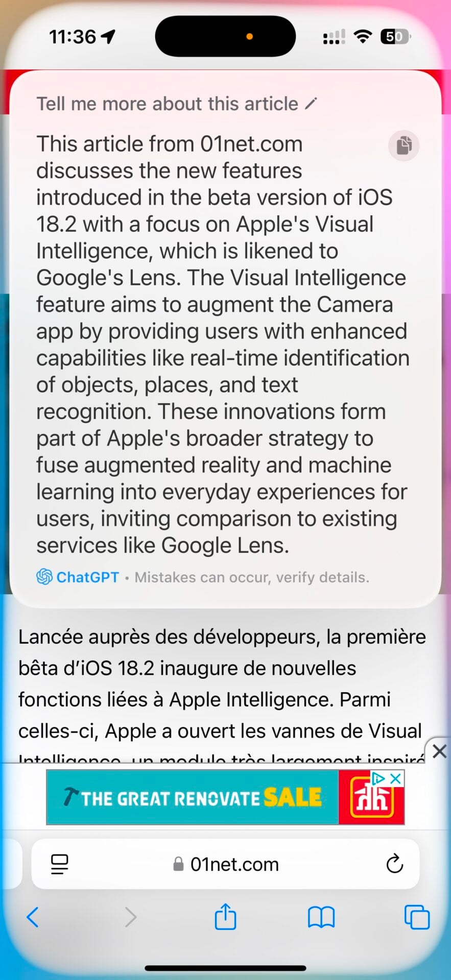 Mais l’intégration de ChatGPT ne s’arrête pas là. Rien n’empêche en effet d’analyser une image présente à l’écran. Et cela fonctionne avec à peu près tout, grâce à la multimodalité de GPT-4o : un article d’un site web peut ainsi être analysé par l’assistant.