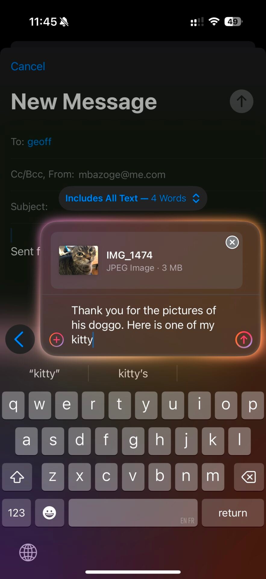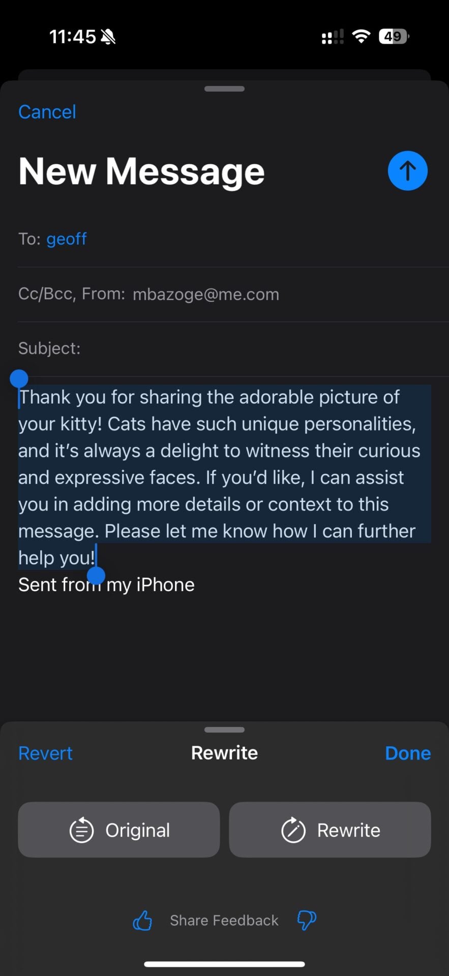 ChatGPT peut également épauler les outils d’aide à l’écriture d’Apple Intelligence, on peut par exemple s’en servir dans Mail pour rédiger le brouillon d’un courriel, et même joindre un fichier ou une image pour donner du contexte supplémentaire. Le texte généré doit absolument être relu et modifié par l’utilisateur afin d’éviter les bizarreries et les incompréhensions.