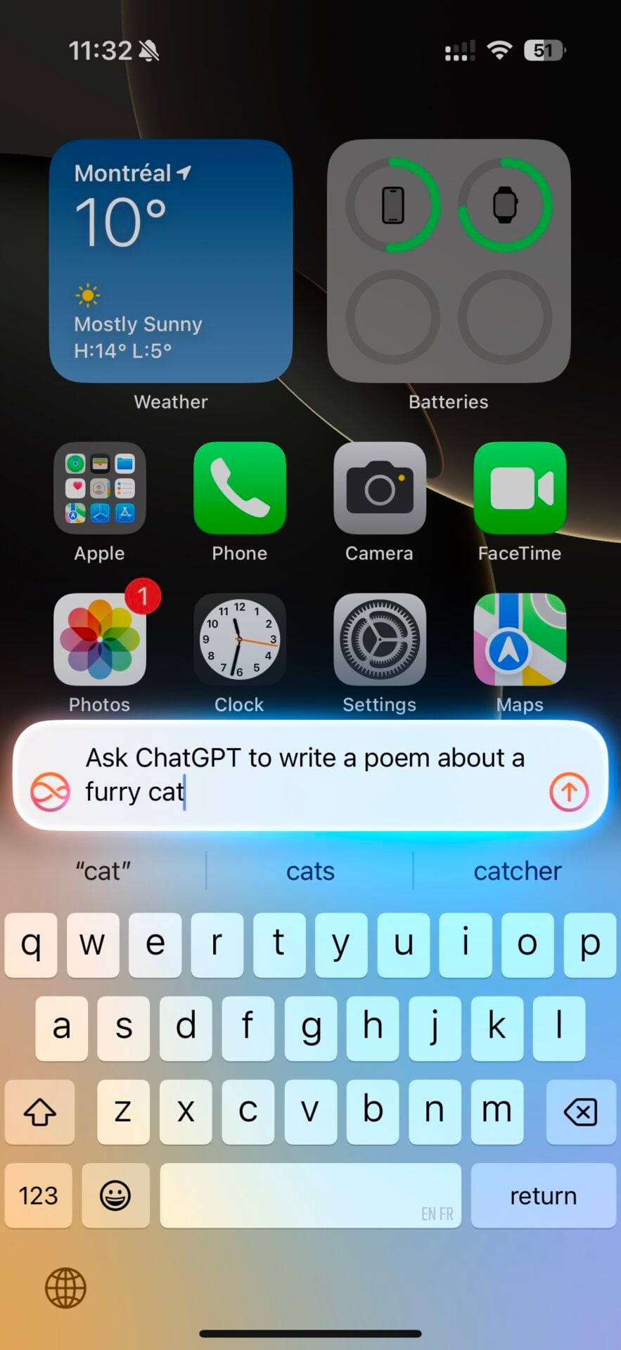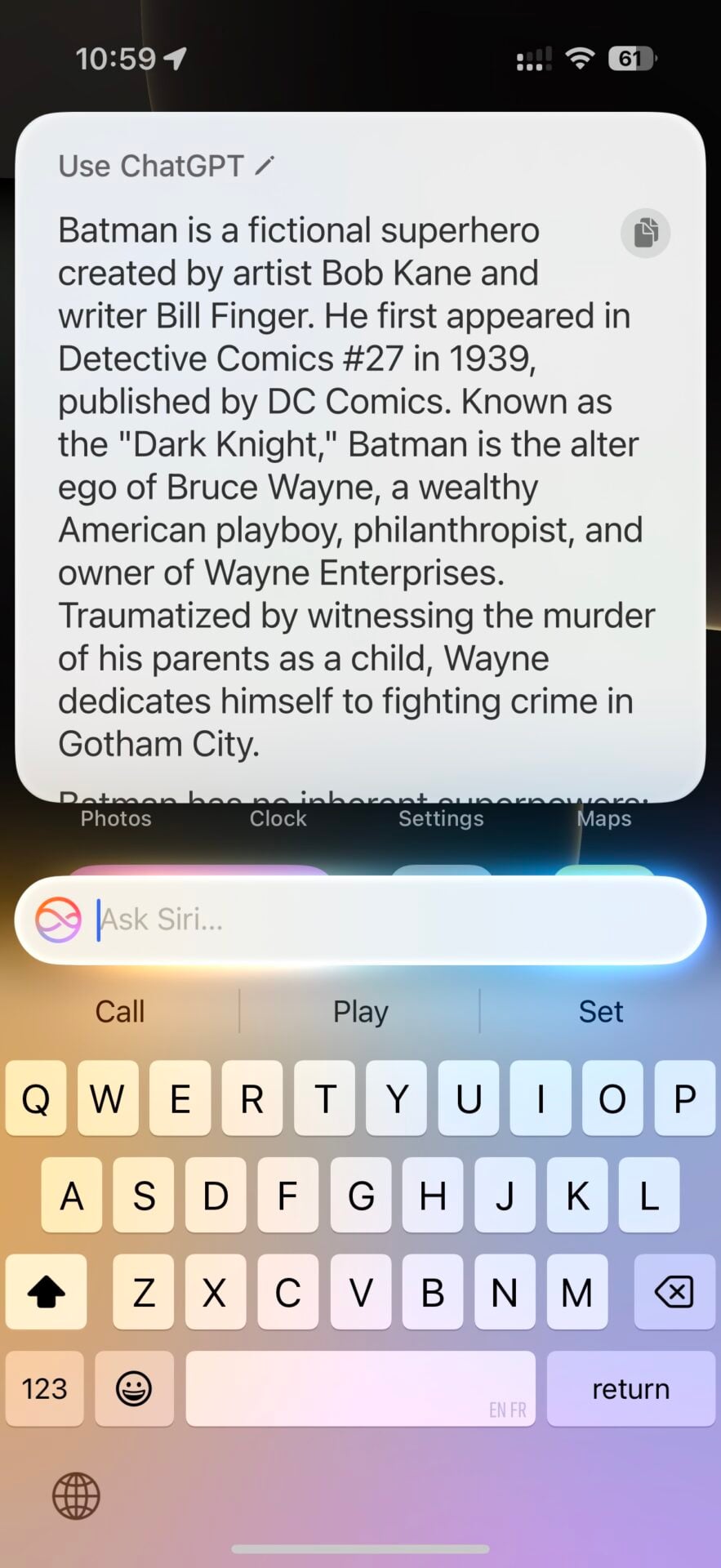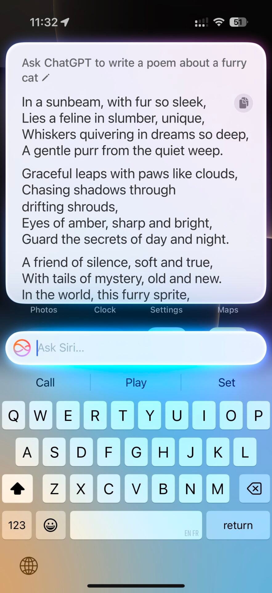 Et si une réponse de Siri n’est pas satisfaisante, il est possible de lui demander expressément de passer la main à ChatGPT. Ou même de commencer une requête par « Ask ChatGPT » directement, auquel cas Siri va s’effacer automatiquement.