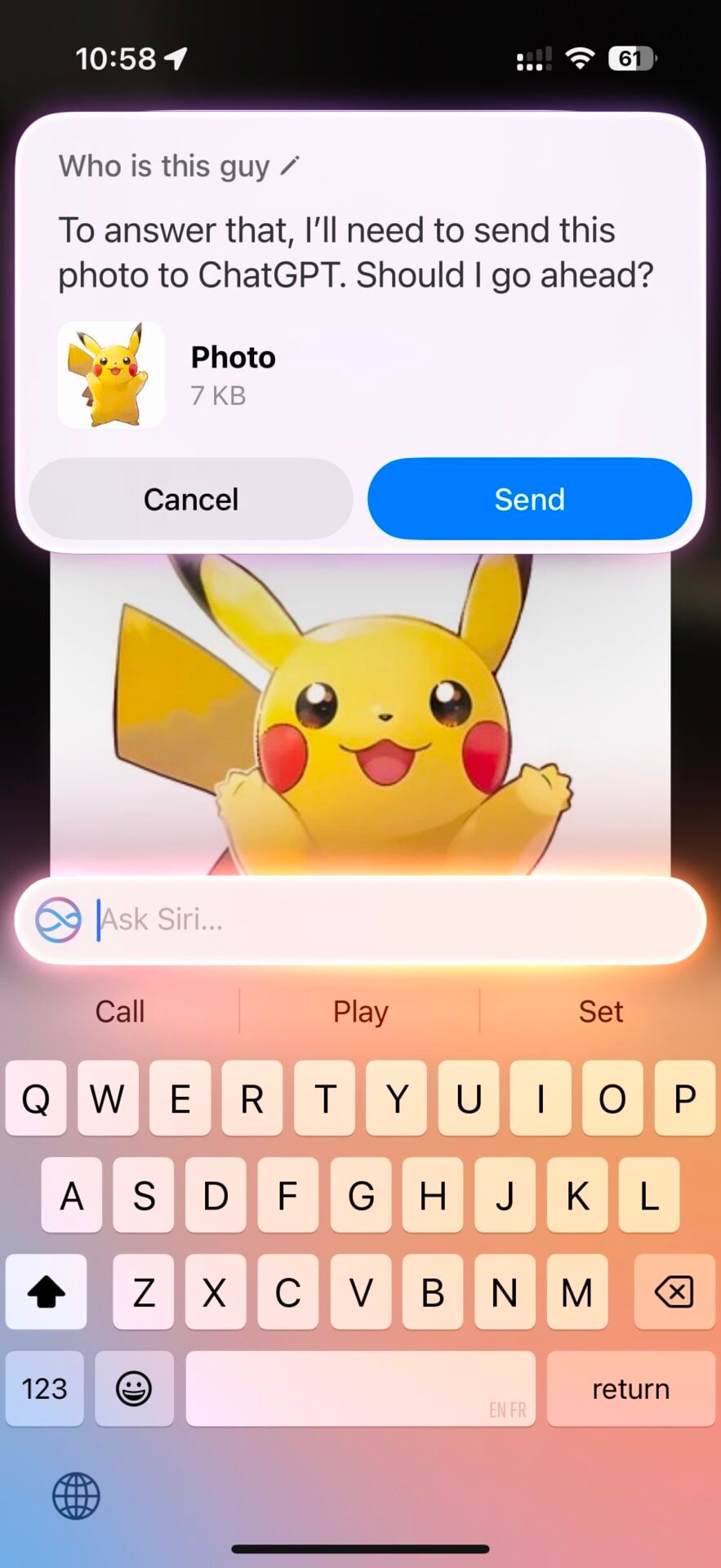 Une fois ChatGPT activé dans les réglages d’iOS, l’assistant d’OpenAI peut répondre à une question sur laquelle Siri sèche. Une option permet de désactiver la permission demandée par Siri pour utiliser ChatGPT ; en revanche, Siri demandera toujours l’autorisation pour transférer un fichier.