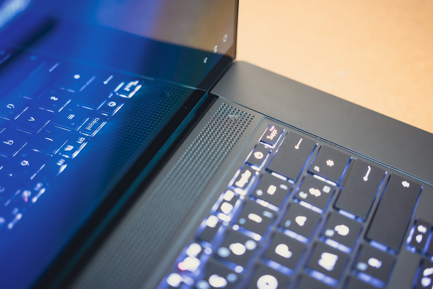 - Au-dessus du clavier, un effort particulier a été porté sur la grille d’aération. Plutôt que des trous classiques, Asus a intégré des petites billes trouées qui donnent une texture et un look très sympa à cette partie du laptop que l’on côtoie finalement beaucoup.