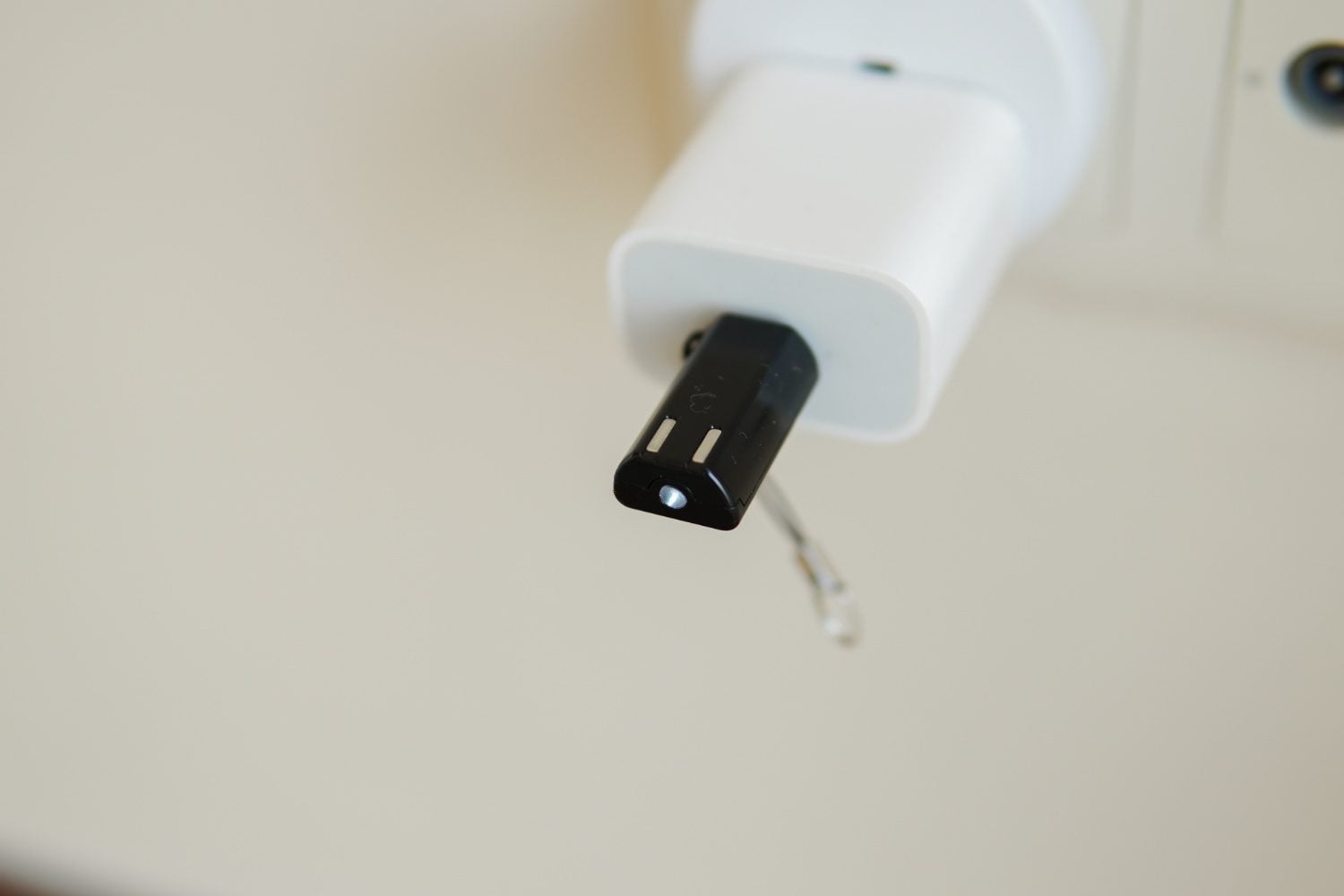 En effet, la Circular Ring Slim ne possède pas de socle à proprement parler. Il s’agit plutôt d’une petite tige, façon clé USB, où l’on vient positionner l’anneau dessus. Pas de câble : ce petit dispositif se branche à même l’adaptateur pour une prise murale, ou à même une prise USB-C. Et ce n’est pas très stable : à de multiples reprises, nous avons dû recommencer la charge après nous être rendu compte que l’anneau n’était pas bien positionné ou avait bougé au fil du temps.