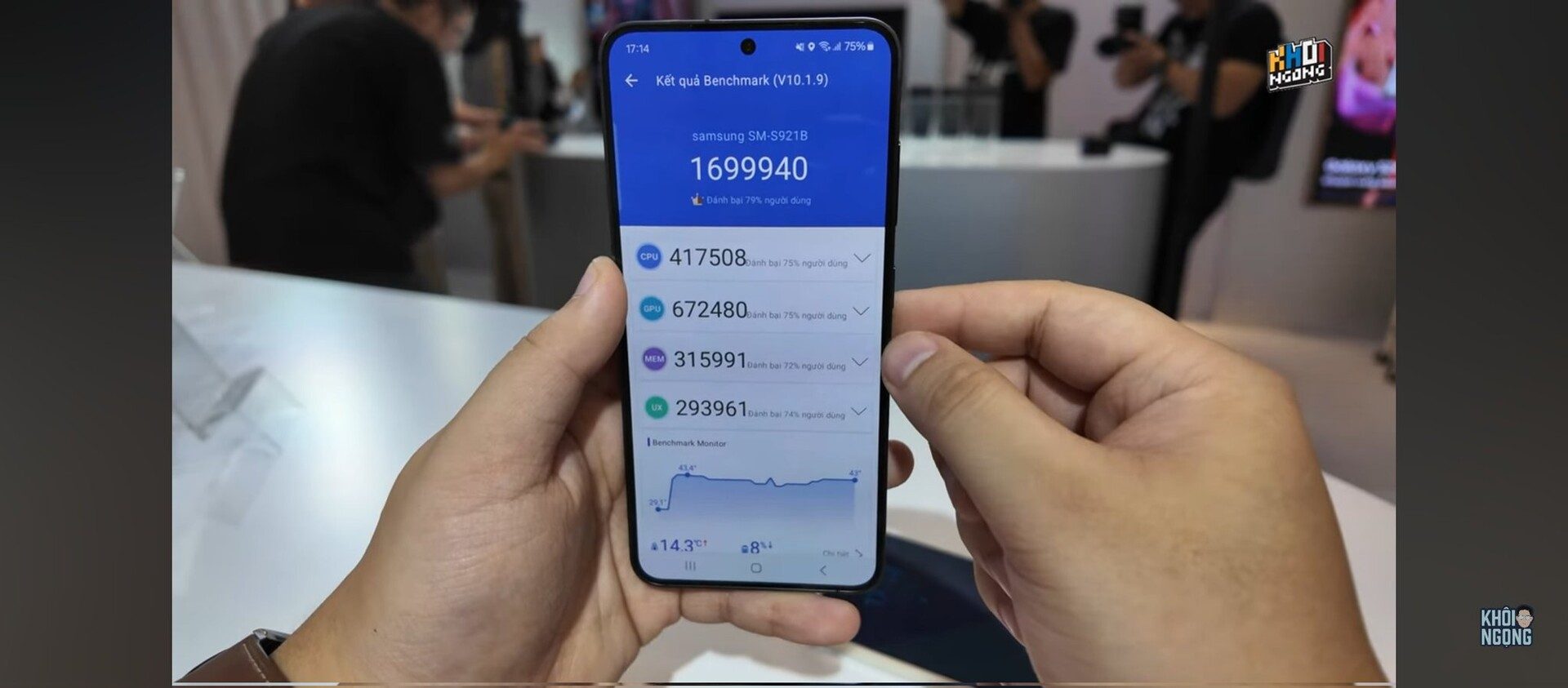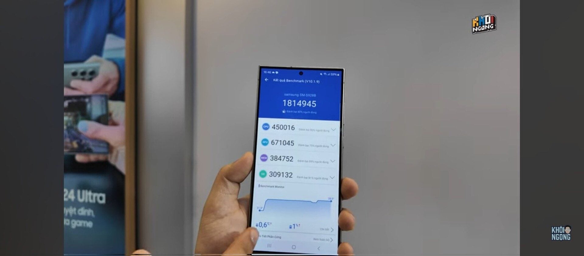 Le score AnTuTu du Galaxy S24 à gauche, celui de la version Ultra à droite. – Source : Khôi Ngọng sur YouTube.