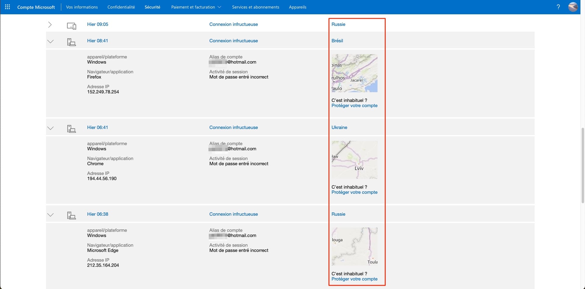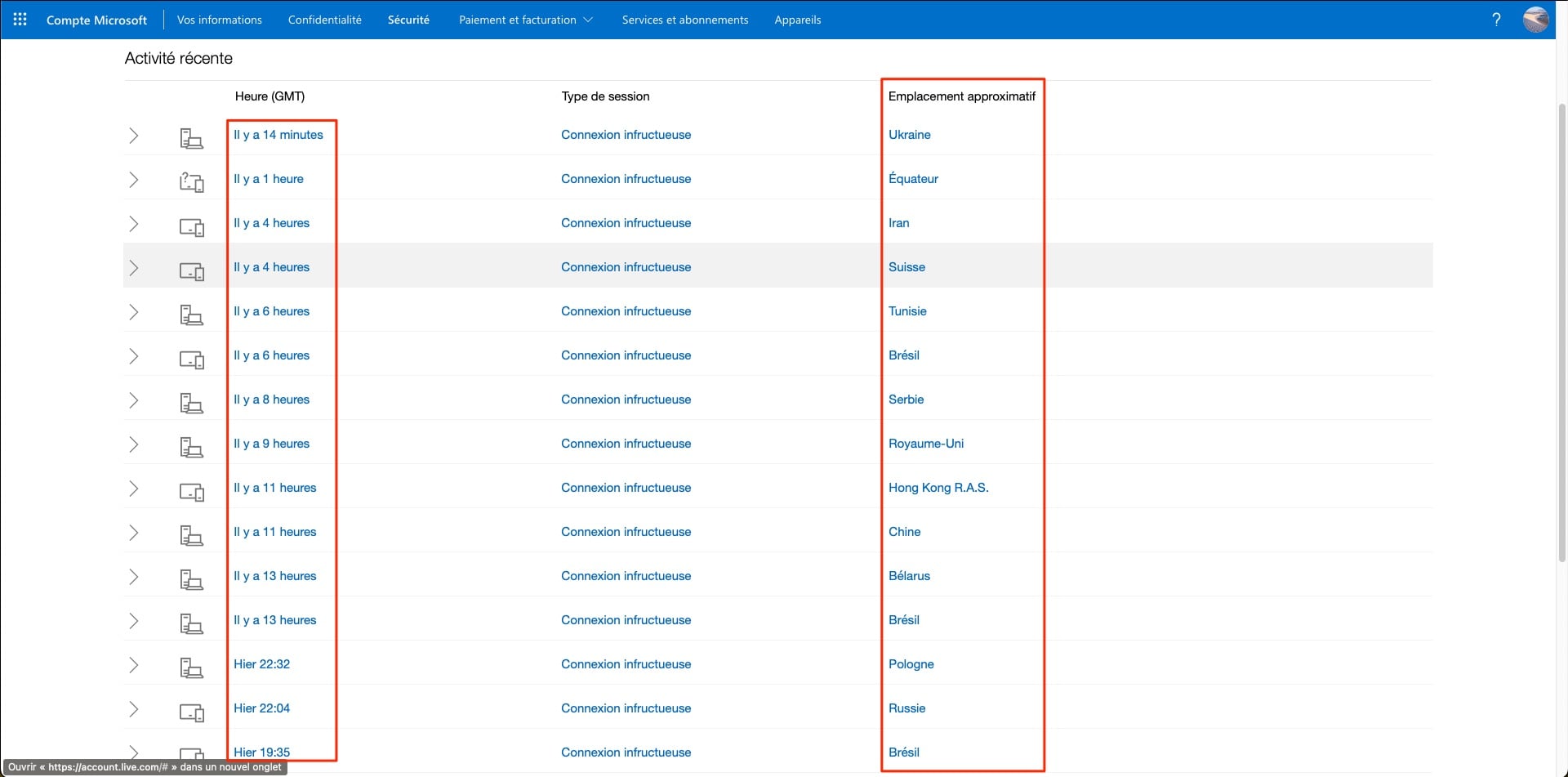 Alors même que vous l’ignoriez totalement, vous découvrirez, dans certains cas, des tentatives (heureusement infructueuses) de connexion à vos comptes, provenant du monde entier. Les pirates tentent leurs chances, jusqu’à ce qu’ils tombent sur un compte dont le propriétaire n’a pas pris les mesures nécessaires pour sécuriser l’accès à ses comptes. Frissons garantis !