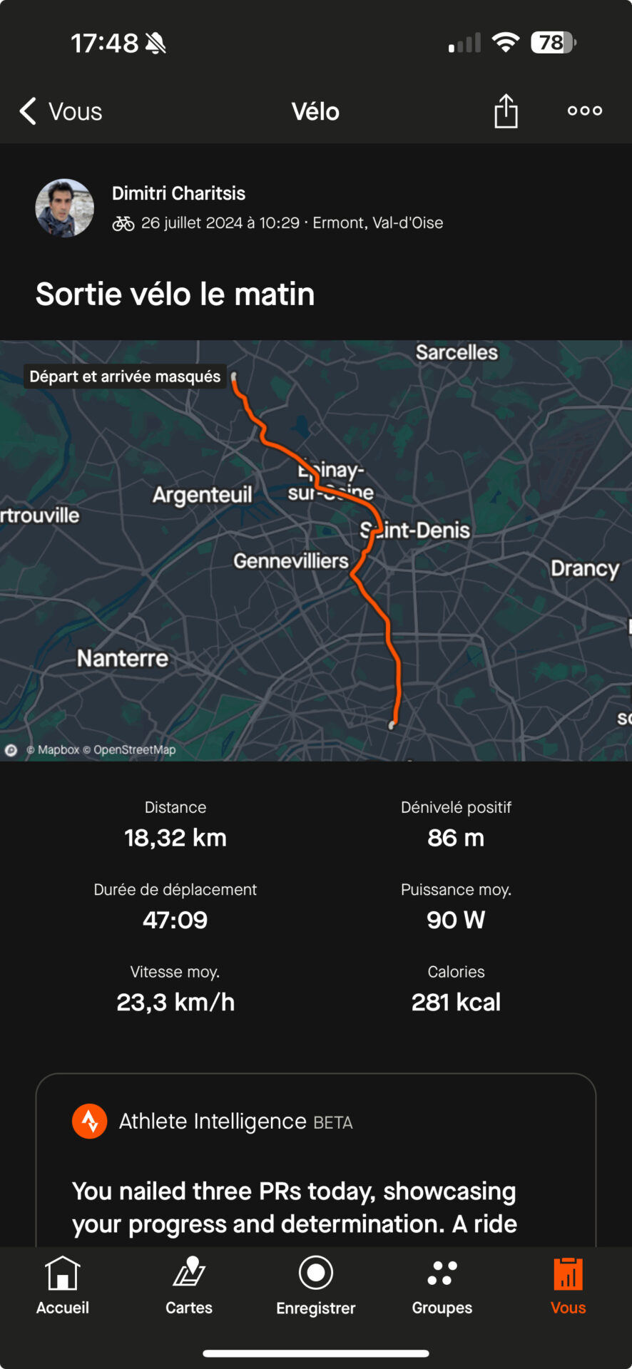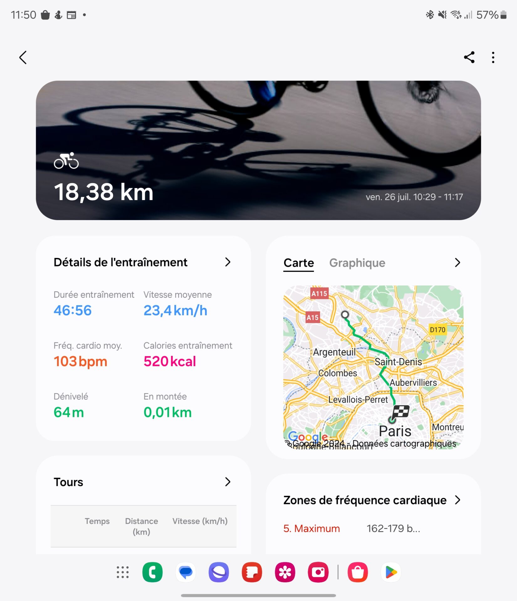 Pour prendre la mesure de la qualité du suivi GPS de la Galaxy Watch Ultra, nous nous arrêterons sur deux exemples dans la douzaine d’activités réalisées avec la montre au poignet. Elles illustrent parfaitement l’intérêt d’un GPS double bande. Notre premier exemple concerne un semi-marathon sur lequel la tocante de Samsung affiche exactement le même kilométrage (21,13 km) que notre montre de référence, la Garmin Forerunner 965. Sur un parcours urbain assez dégagé, elle colle donc à ce que peut fournir une montre dédiée au sport. Précisons d’ailleurs que nous avons constaté la même pertinence sur du trail en forêt dans des zones nettement moins bien couvertes. Notre second exemple reprend notre trajet test en vélo. Sur ce trajet d’un peu moins de 20 km, 18,32 km très précisément, la Galaxy Watch Ultra a relevé un parcours de 18,38 km. Cet écart de 60 m sur un total de 20 km est parfaitement anodin et confirme que la montre de Samsung est un modèle de précision GPS.