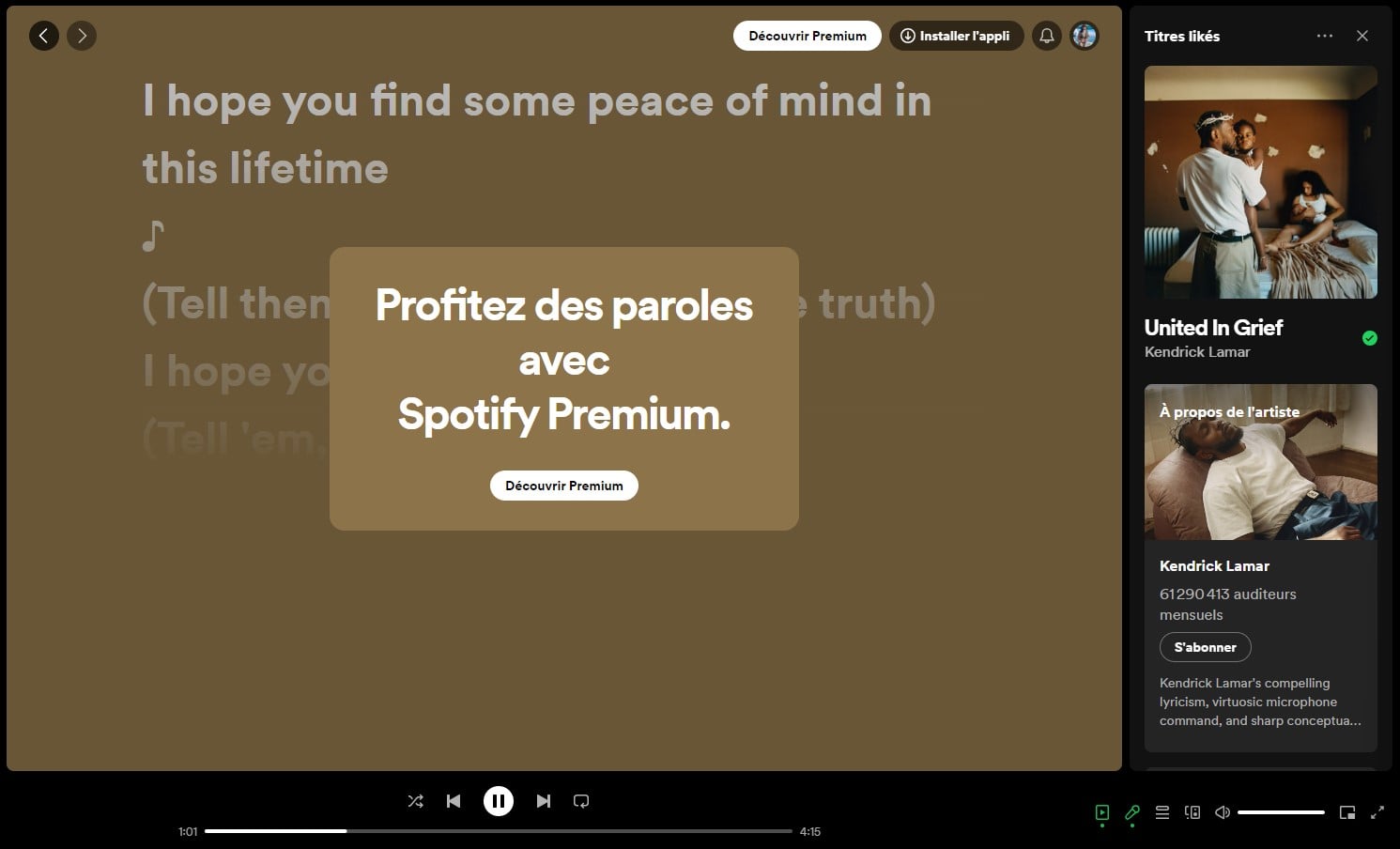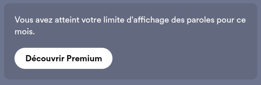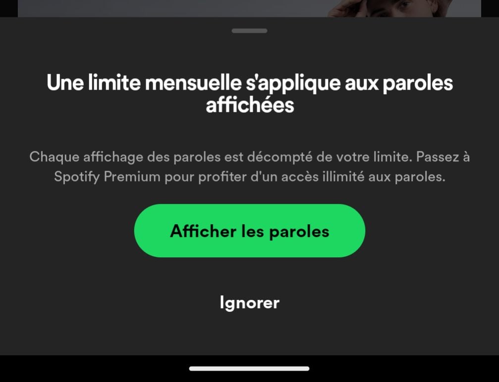 En revanche, sur l’application Android, nous avons bien pu obtenir l’affichage des paroles, avant de voir apparaître une fenêtre indiquant : « Une limite mensuelle s’applique aux paroles affichées. » Après avoir écouté cinq titres, nous avons ensuite vu s’afficher « Vous avez atteint votre limite d’affichage des paroles pour ce mois. »