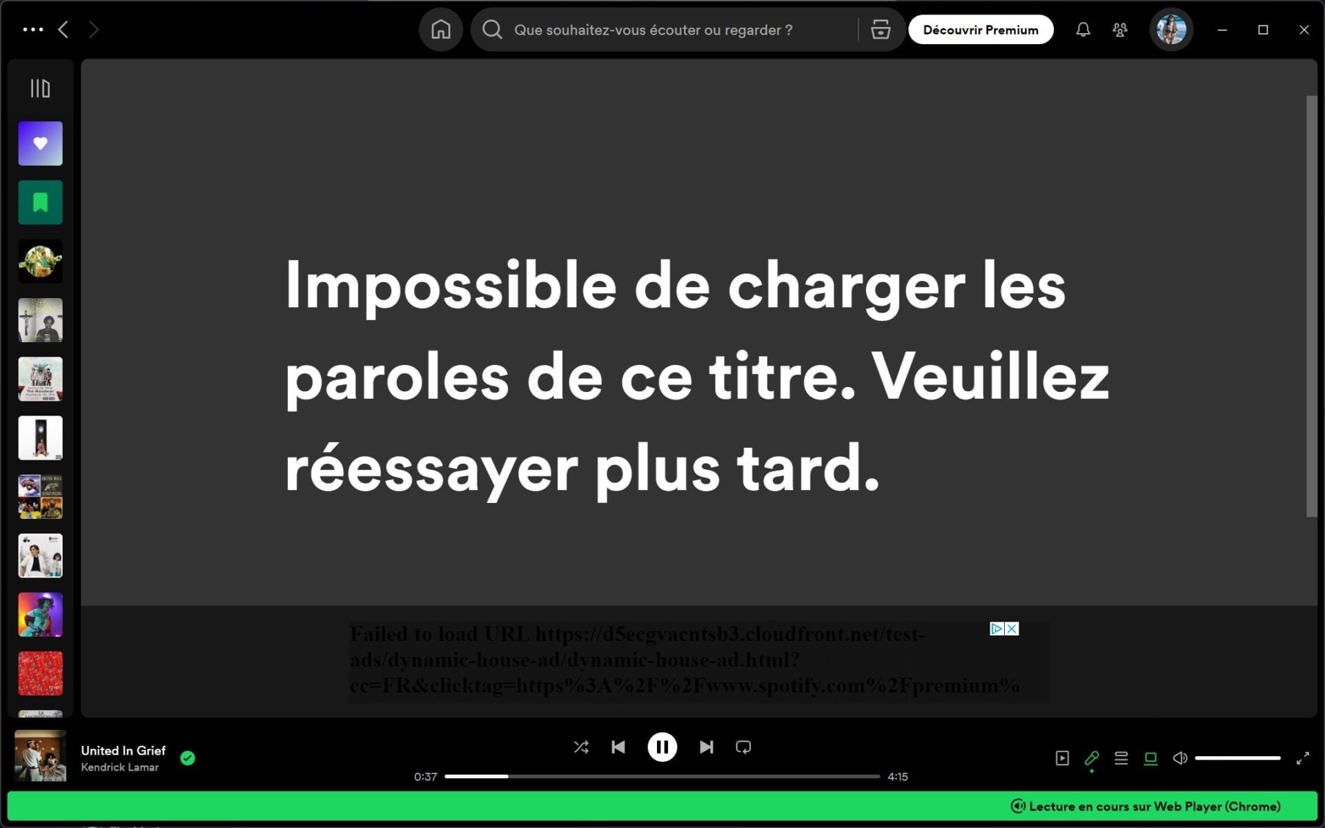 Nous avons nous-mêmes constaté sur un compte non-premium qu’il était désormais impossible d’afficher les paroles. L’affichage est d’ailleurs un peu différent sur l’application et sur la page web. Sur cette dernière, Spotify indique clairement son intention en écrivant « Profitez des paroles avec Spotify Premium », tandis que sur l’application Windows, nous avons obtenu un simple message d’erreur.