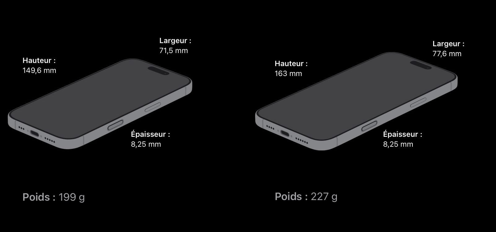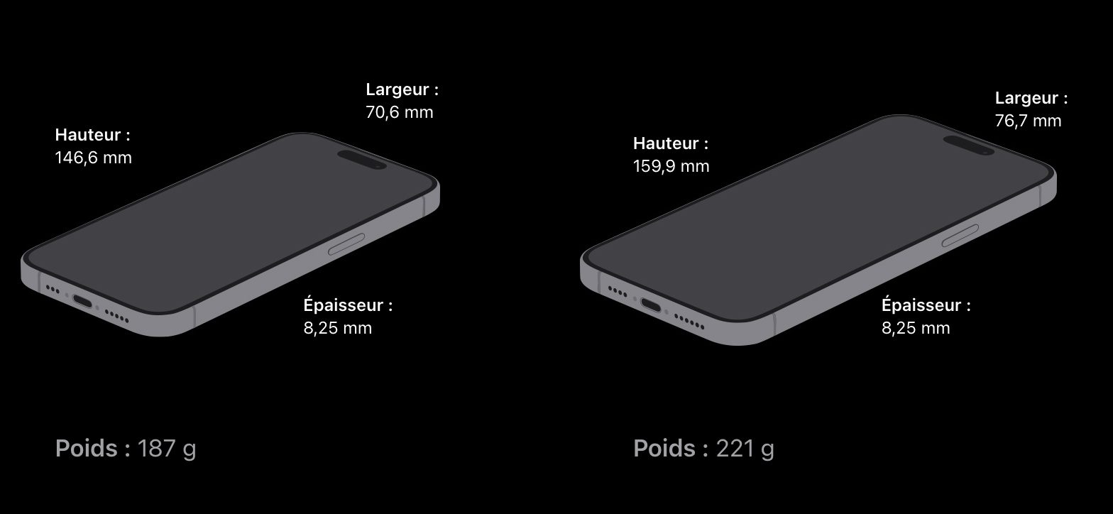 Fort heureusement, Apple a limité la casse puisque les deux modèles restent plus légers que les modèles de 2022. L’iPhone 14 Pro pesait 206 g et l’iPhone 14 Pro Max 240 g. Le gain demeure donc substantiel par rapport à ces modèles.