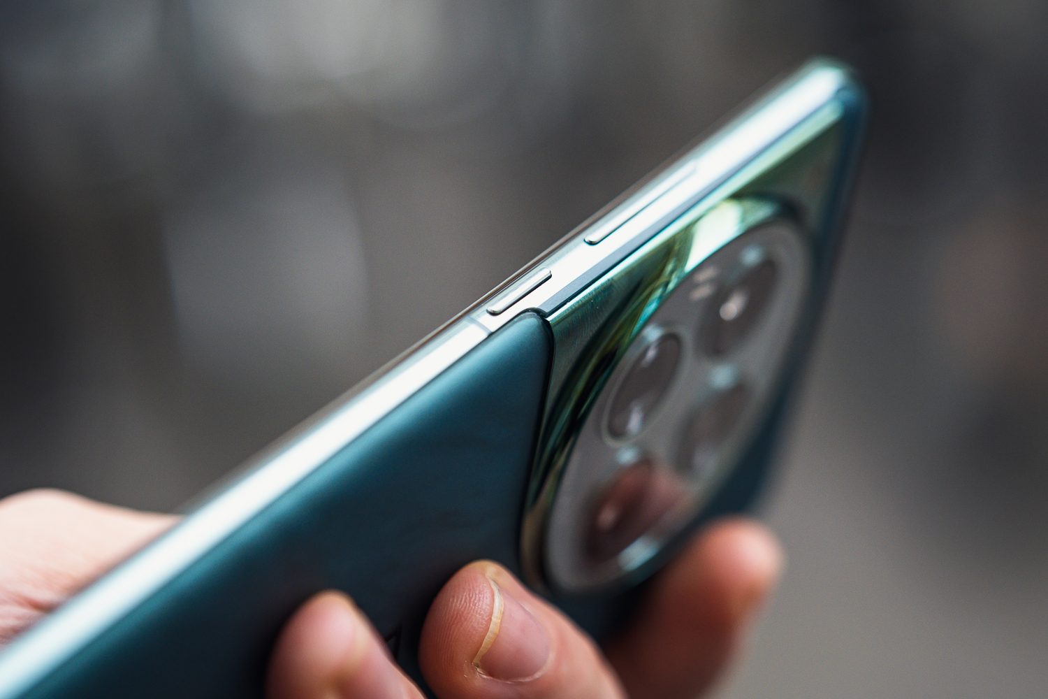 Passons à la tranche, puisque nous en parlions. Celle-ci se montre plutôt fine, du fait que le dos et l’écran sont incurvés dans sa direction. Elle s’épaissit sur le haut et le bas. Les boutons de volume et de verrouillage sont rassemblés à droite, le tiroir à SIM est en bas et l’alert slider, marque de fabrique de OnePlus se situe à gauche.