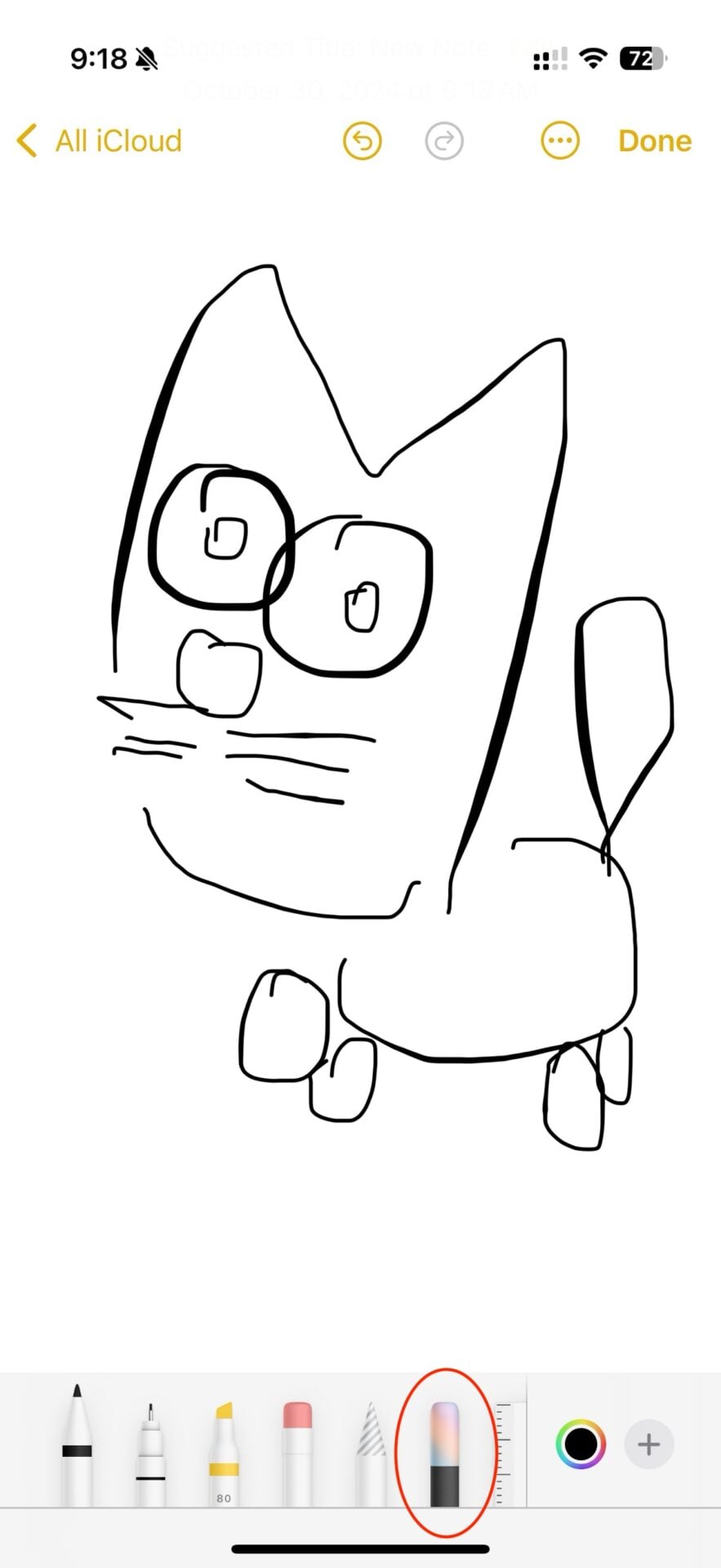 Mais Image Playground n’est pas qu’une application. C’est aussi une fonction intégrée à Notes. Il suffit de dessiner (parfois très grossièrement) l’image que l’on veut insérer dans la note, puis d’utiliser le nouvel outil baptisé Image Wand, présent dans le tiroir qui contient les pinceaux et autres stylos (entouré en rouge ci-dessous).