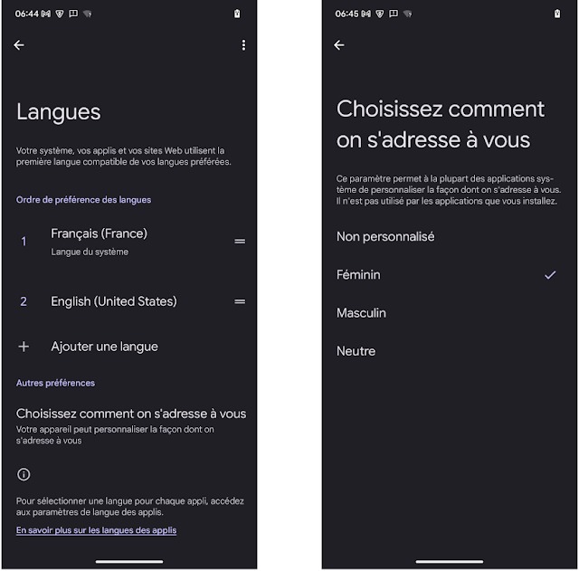 La France profite d’une nouveauté d’inclusivité avant le reste du monde : désormais, comme c’est le cas sur l’iPhone, vous allez pouvoir préciser votre genre à votre smartphone. Quatre options sont proposées : féminin, masculin, neutre et non personnalisé.
