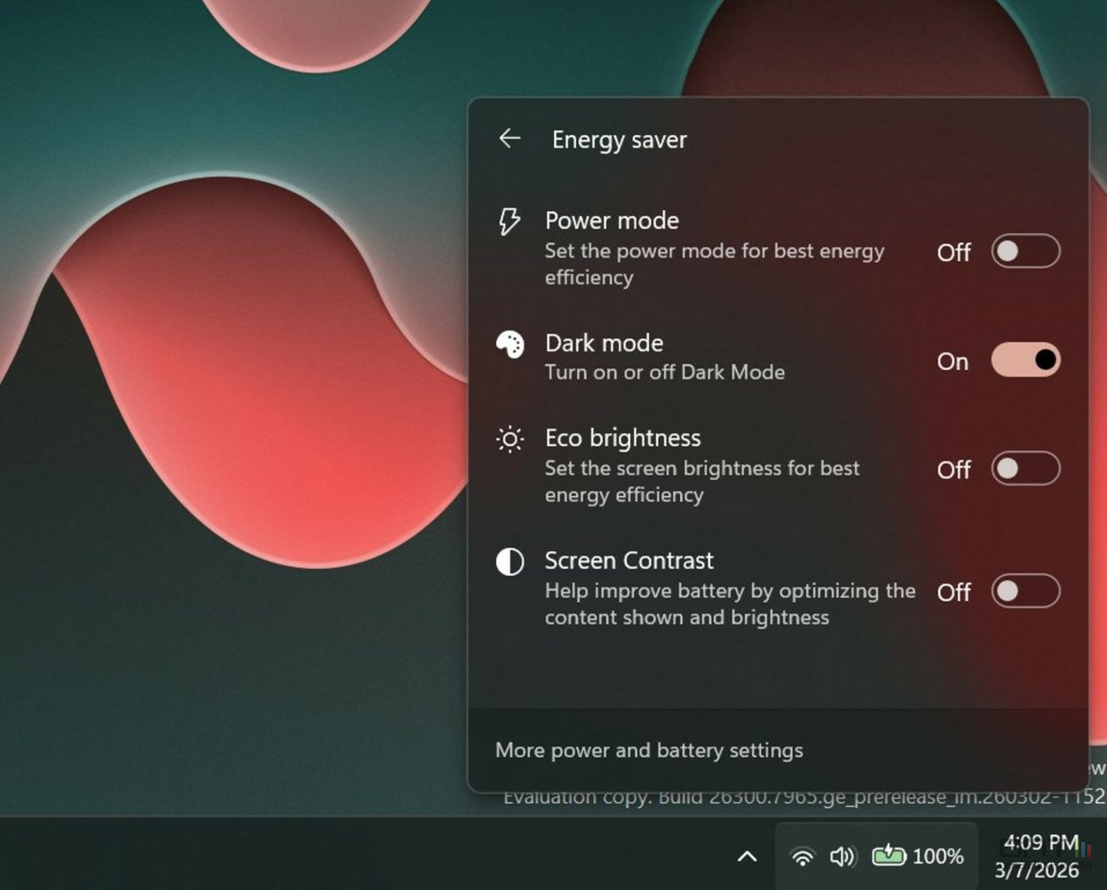 En attendant la grande refonte, une amélioration plus pragmatique et immédiate se profile à l’horizon. Une version test de l’OS (build 26300.796) révèle l’intégration d’une bascule dédiée au Mode sombre au sein des réglages rapides. Fini les clics à n’en plus finir dans les méandres des paramètres de personnalisation. La nouvelle option, bien que nichée dans un sous-menu de l’économiseur d’énergie, réduit considérablement les étapes pour changer de thème à la volée.